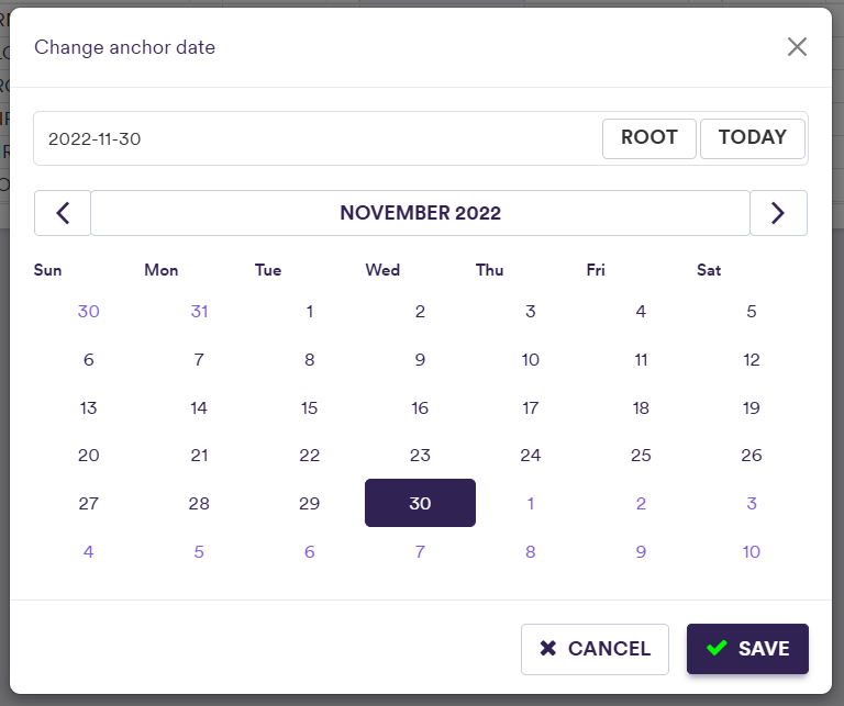 First, you will need to set the anchor date for the sandbox environment to 30th November 2022. To do so, click on the anchor date at the top of the screen, select the desired date and click on