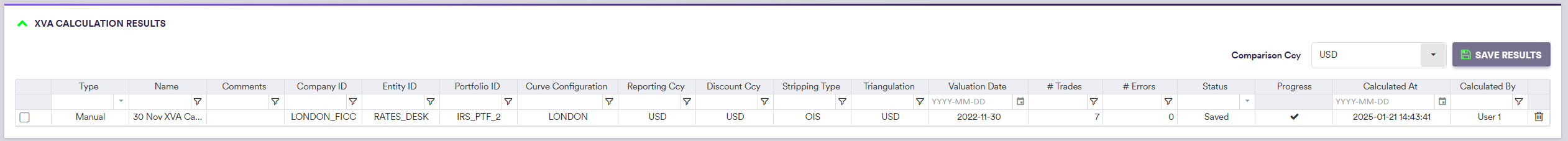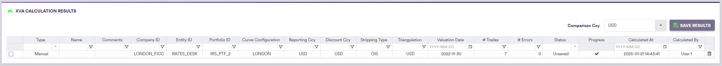After saving, XVA valuation results will also be accessible on a trade level in the trade valuation history screen (see Trade Valuation History).