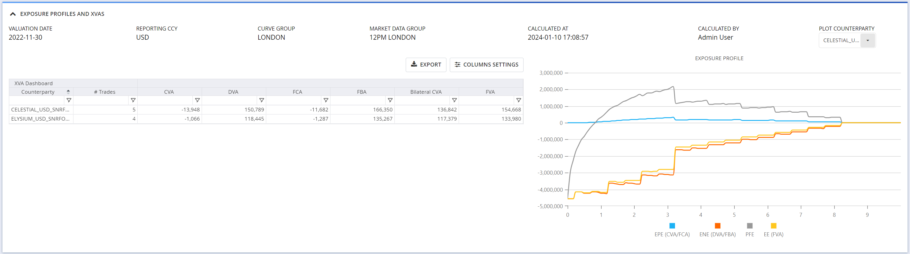 In the ‘Exposure Profiles And XVAs’ window, you can view, filter and export XVA calculation results on a counterparty basis.