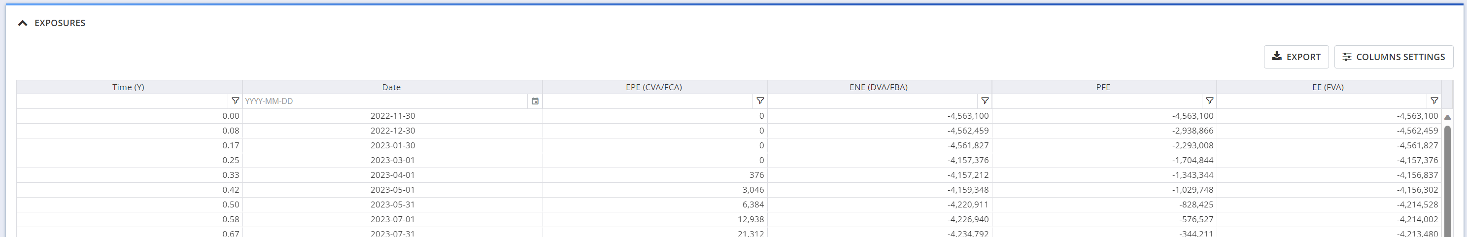 In the ‘Exposures’ window, when applicable, you can see and export exposure simulation results on a counterparty basis.