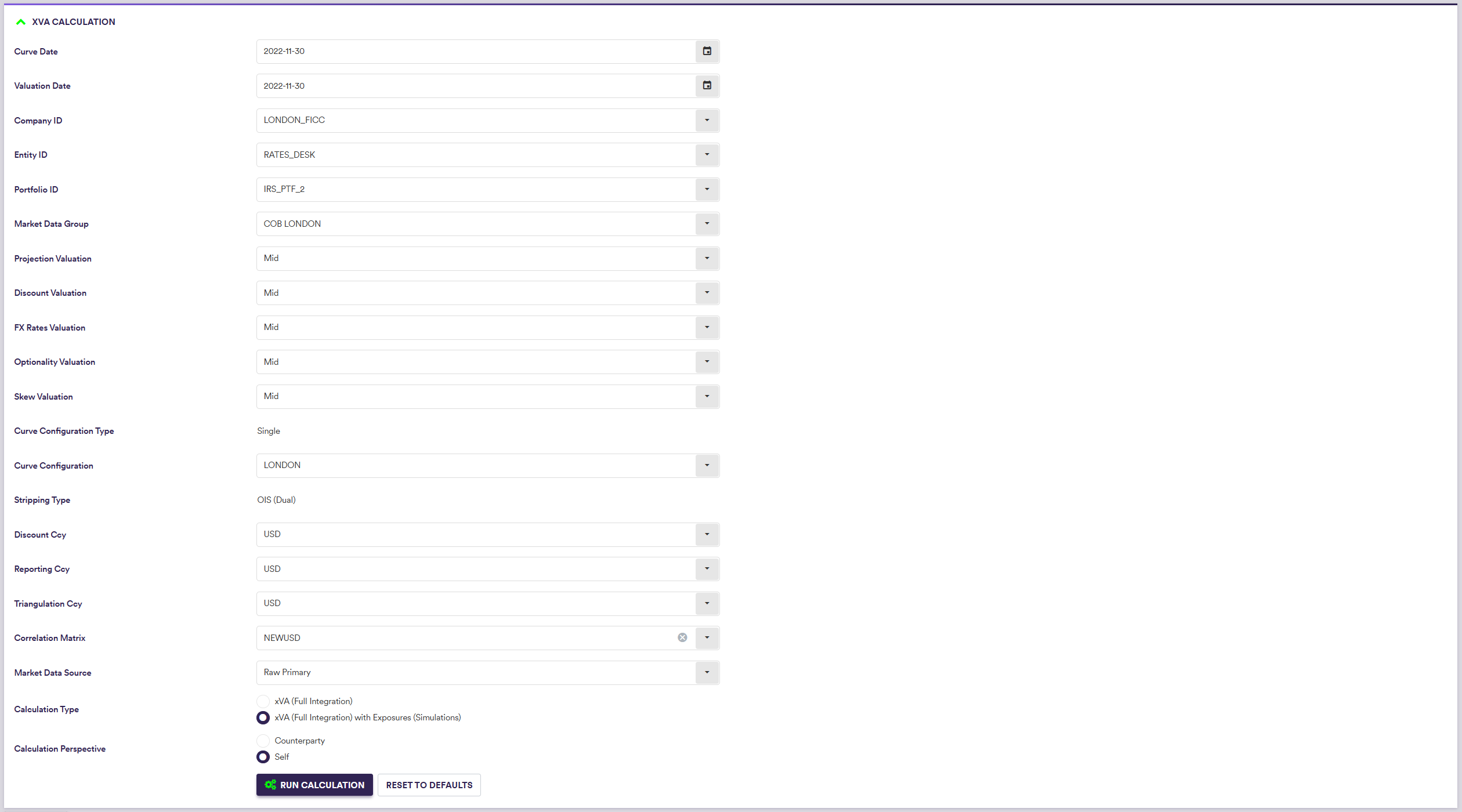 | Calculation Type | XVA calculations only or with simulated underlying exposure calculations |