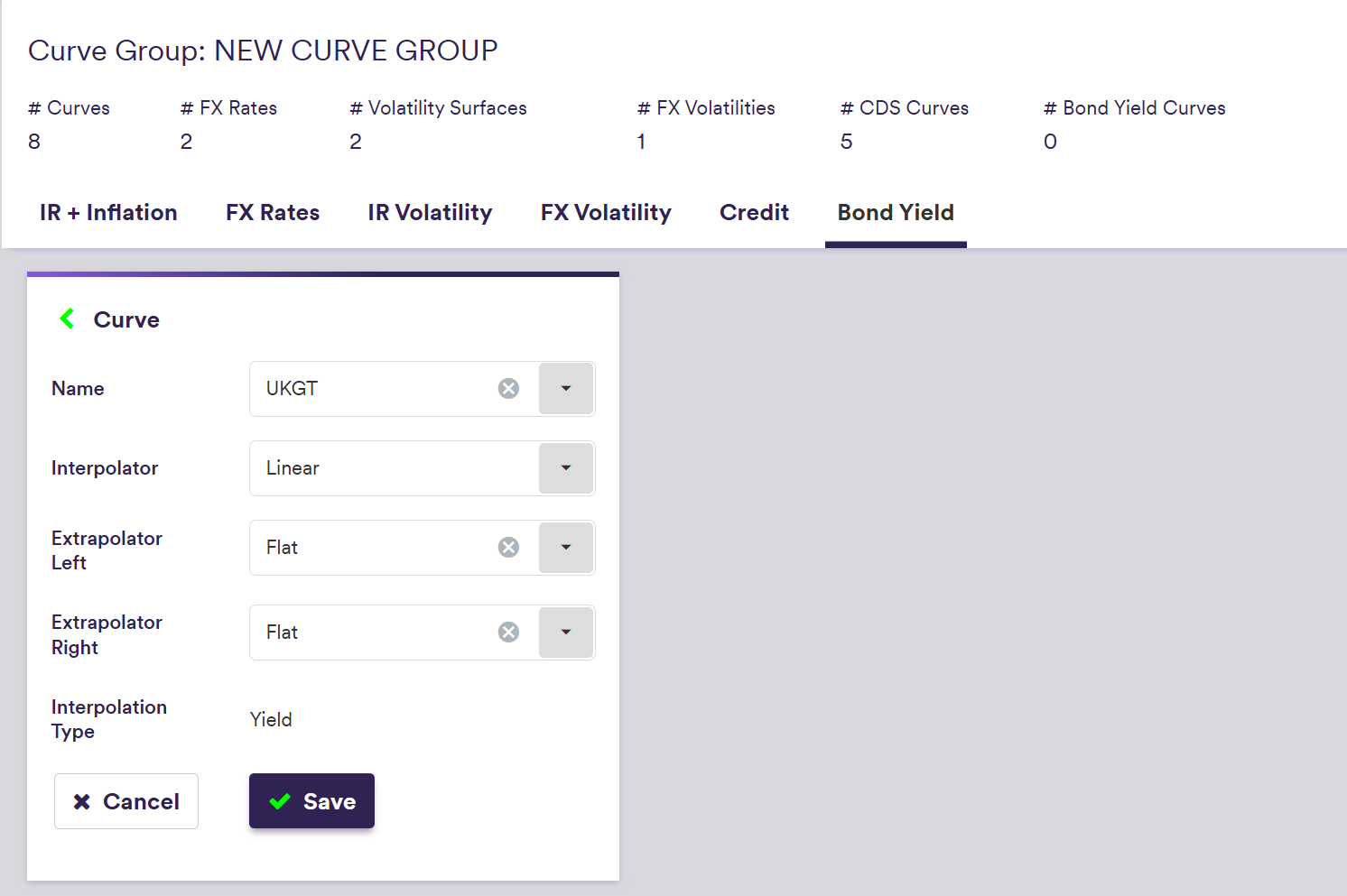 You can also add other types of curves and volatility surfaces to the curve group. Once all required items have been added, you can proceed to the curve configuration set up page.