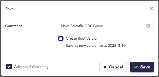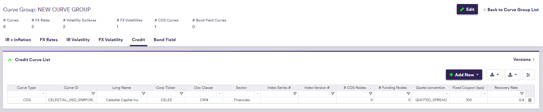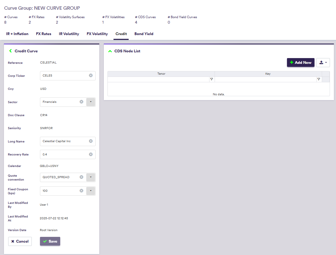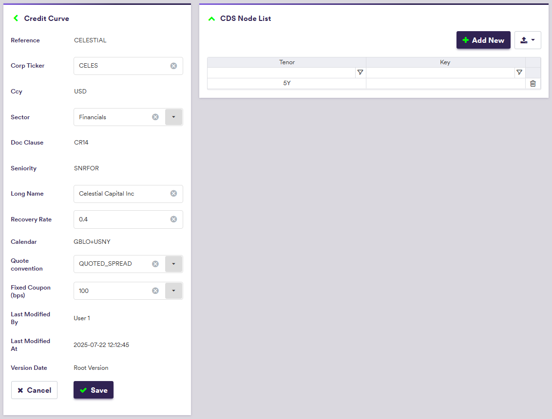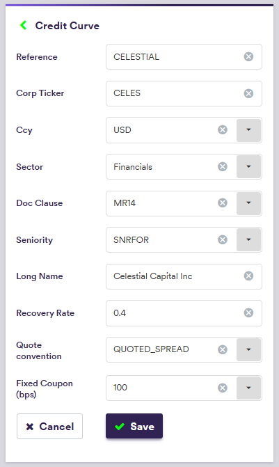 Part of our ‘NEW CURVE GROUP’ example that replicates the ‘LONDON’ curve group, this page will guide you through the process of defining a curve using two examples: manually defining the ‘CELESTIAL USD Senior Unsecured CR14’ CDS curve with a 5y node, or importing all the data. You can download the example .CSV data import files here.