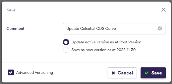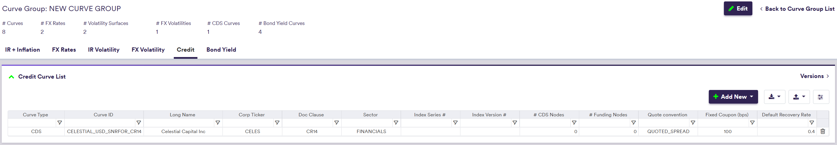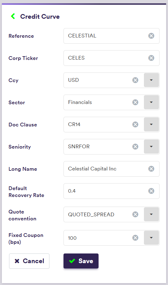 A Curve Id will be automatically generated as Reference & “_” & Ccy & “_” & Seniority & “_” & Doc Clause for a CDS curve (e.g. ‘CELESTIAL_USD_SNRFOR_CR14’) and Reference & “_” & Ccy for a Credit Index curve (e.g. ‘2I65BYEB7_USD’). Such Curve Id will constitute the credit curve’s unique identifier.