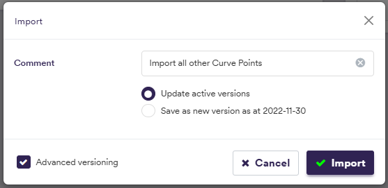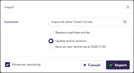 The import example below is performed at the credit curve level but in practice, the curve node import should be performed at the credit curve list level (i.e. across all credit curves).