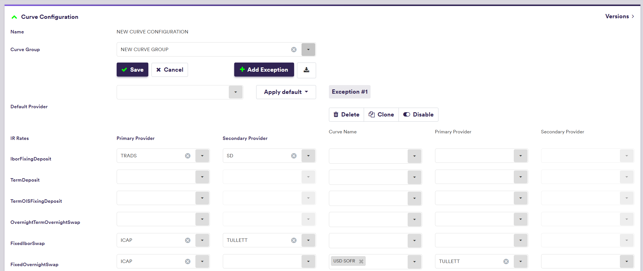 - set up a curve configuration, by selecting a curve group and specifying the mapping to market data providers (primary and secondary, if any) on an instrument type basis