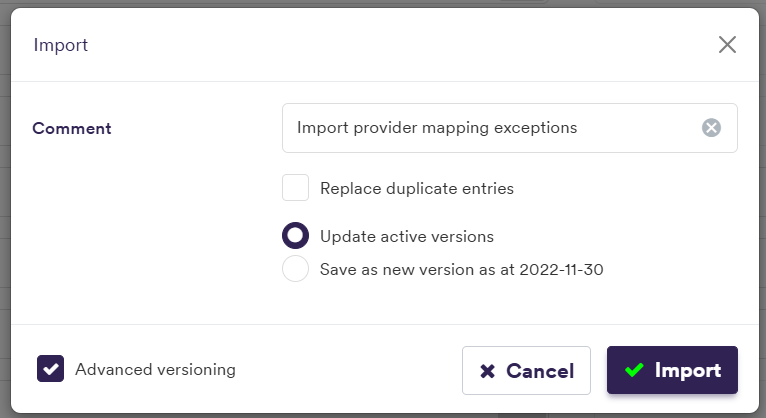 To import a mapping exception (or a list of mapping exceptions), click on (import) and select the relevant mapping exception definition .CSV import file.
