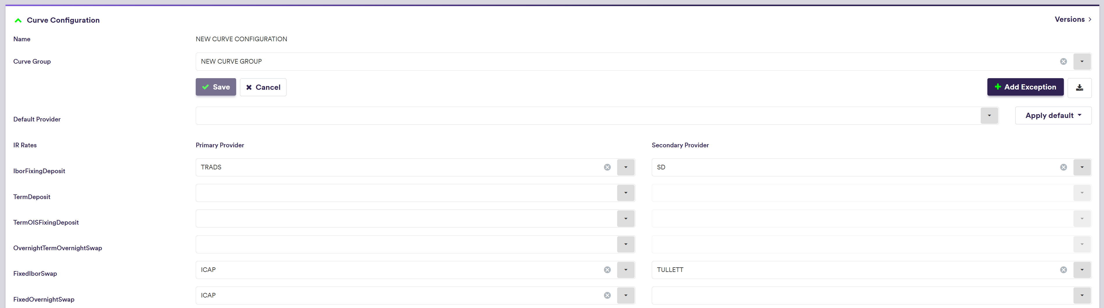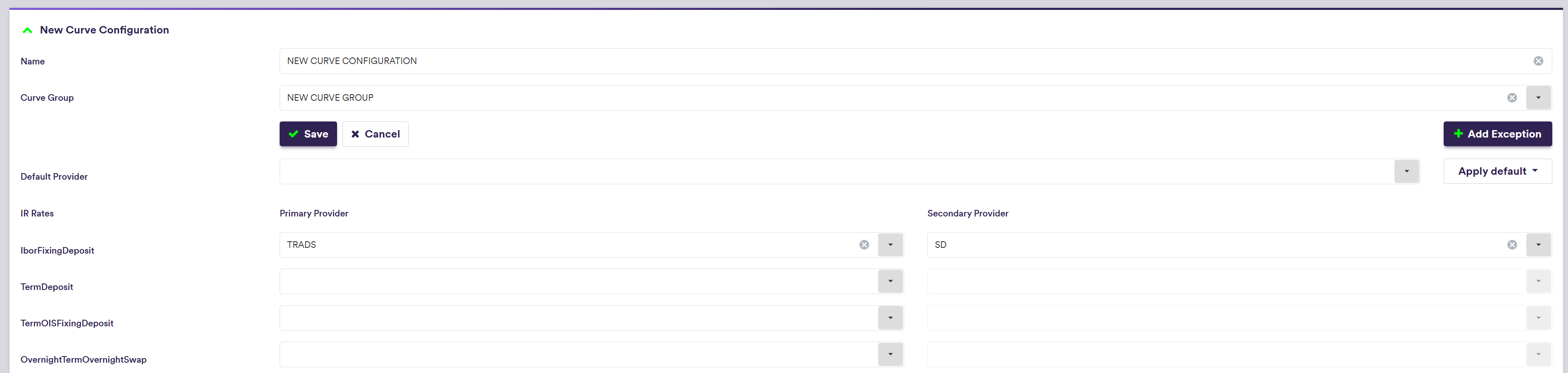 A curve configuration holds the mapping that links a curve group (which needs to be defined first) to preferred data providers (e.g. primary and secondary) on an instrument type basis.
