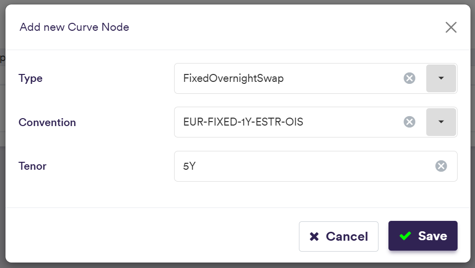 | Tenor (*) | The curve node’s tenor Implied from Convention for Type = “IborFixingDeposit” | Any tenor (e.g. 3M, 10Y) |