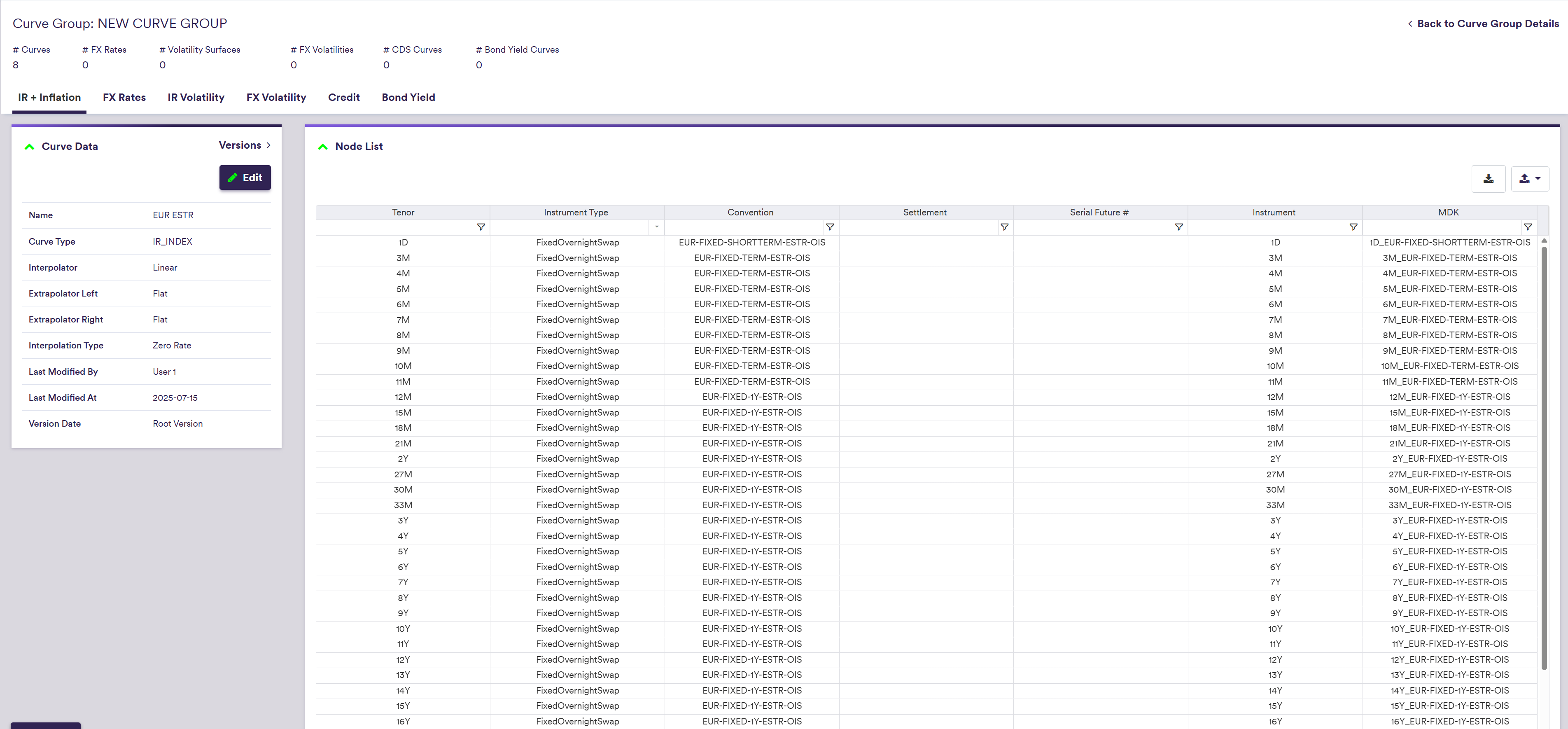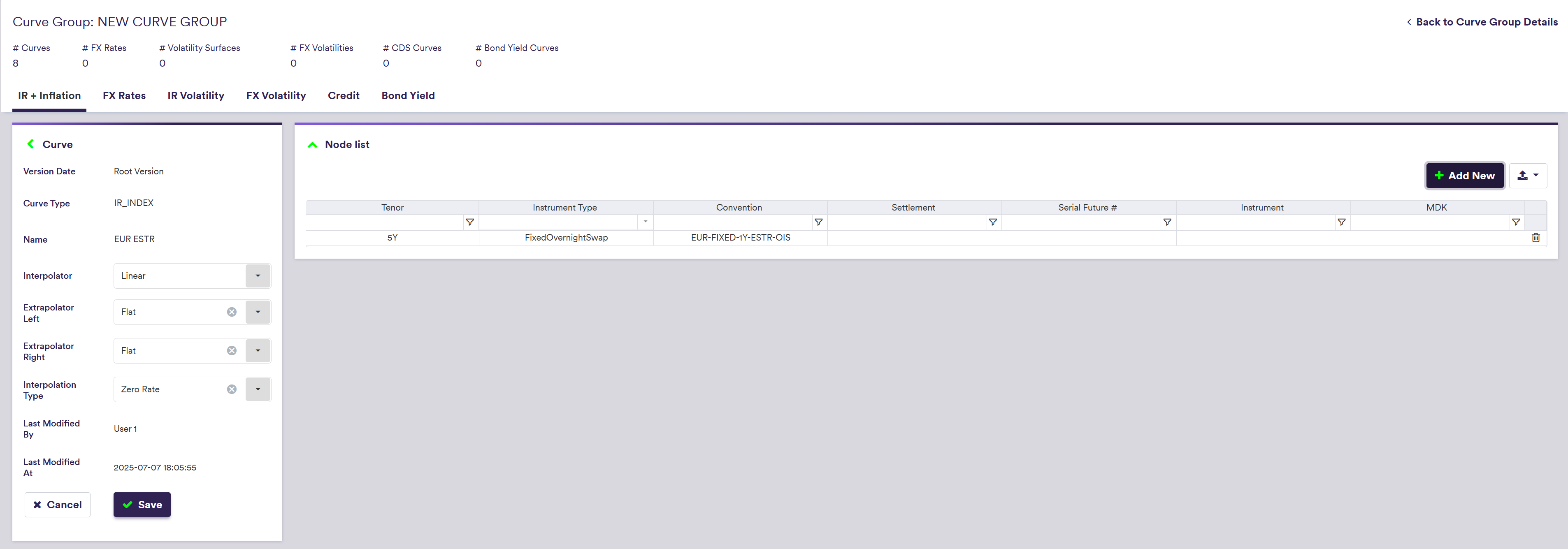 Part of our ‘NEW CURVE GROUP’ example that replicates the ‘LONDON’ curve group, this page will guide you through the process of defining a curve using two examples: manually defining the EUR ESTR curve with a 5y node, or importing all the data.
