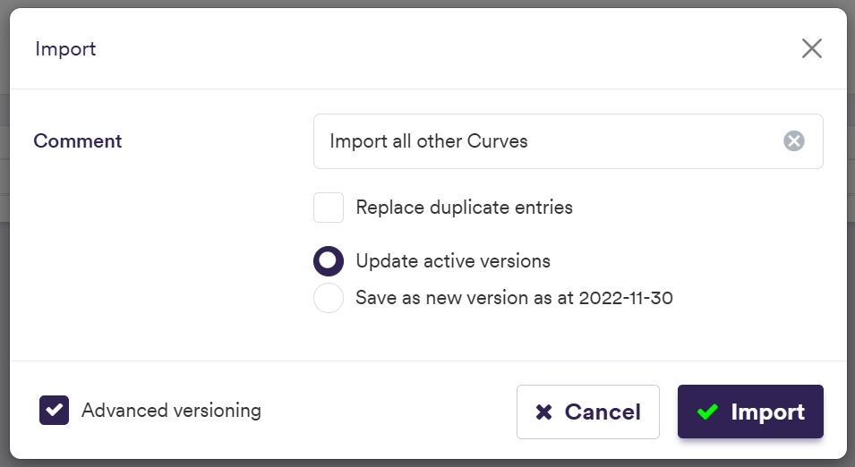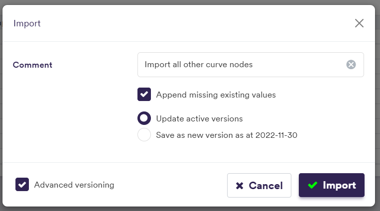 The import example below is performed at the curve level but in practice, the curve node import should be performed at the curve list level (i.e. across all IR + Inflation curves).