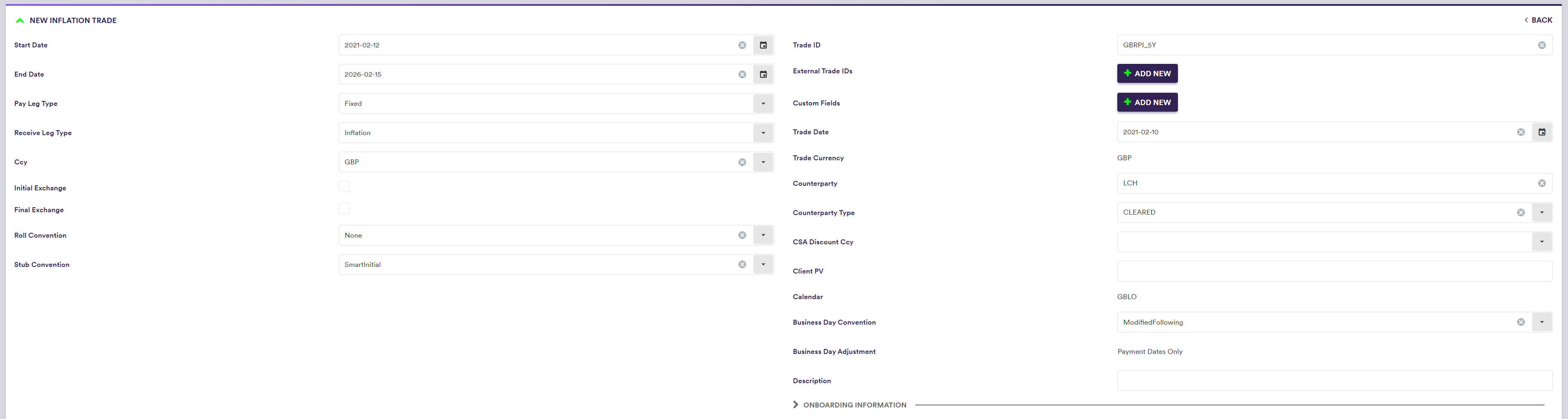 At the trade level, the counterparty type and the counterparty dropdowns will flag cleared inflation trades and which CCH curve they should be mapped to.
