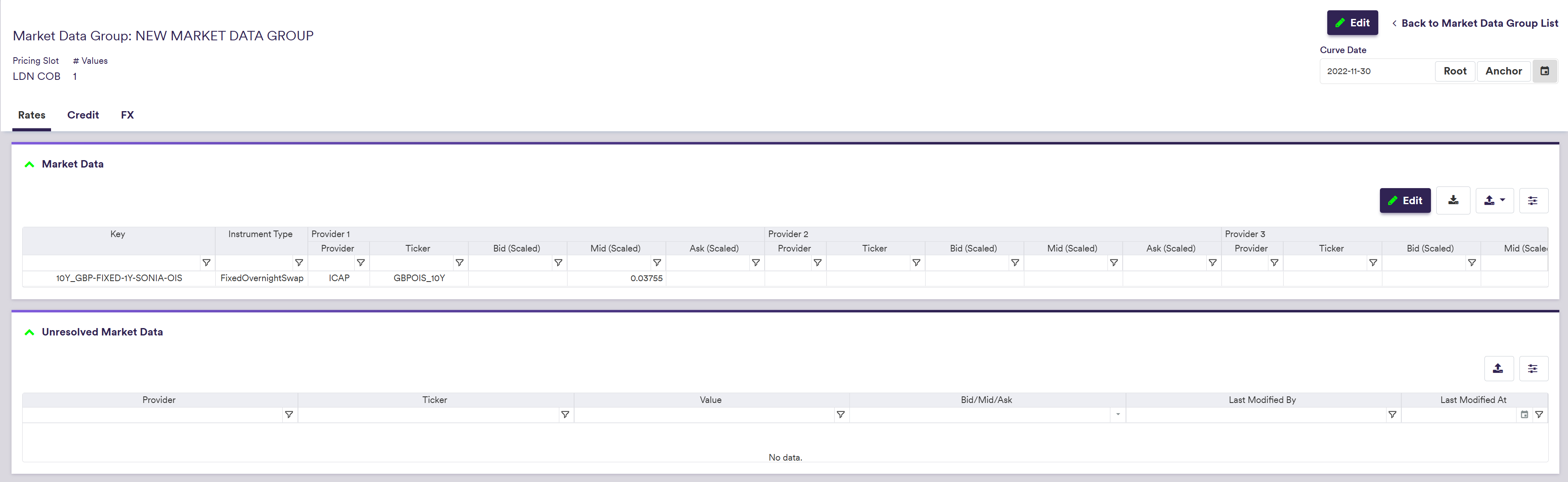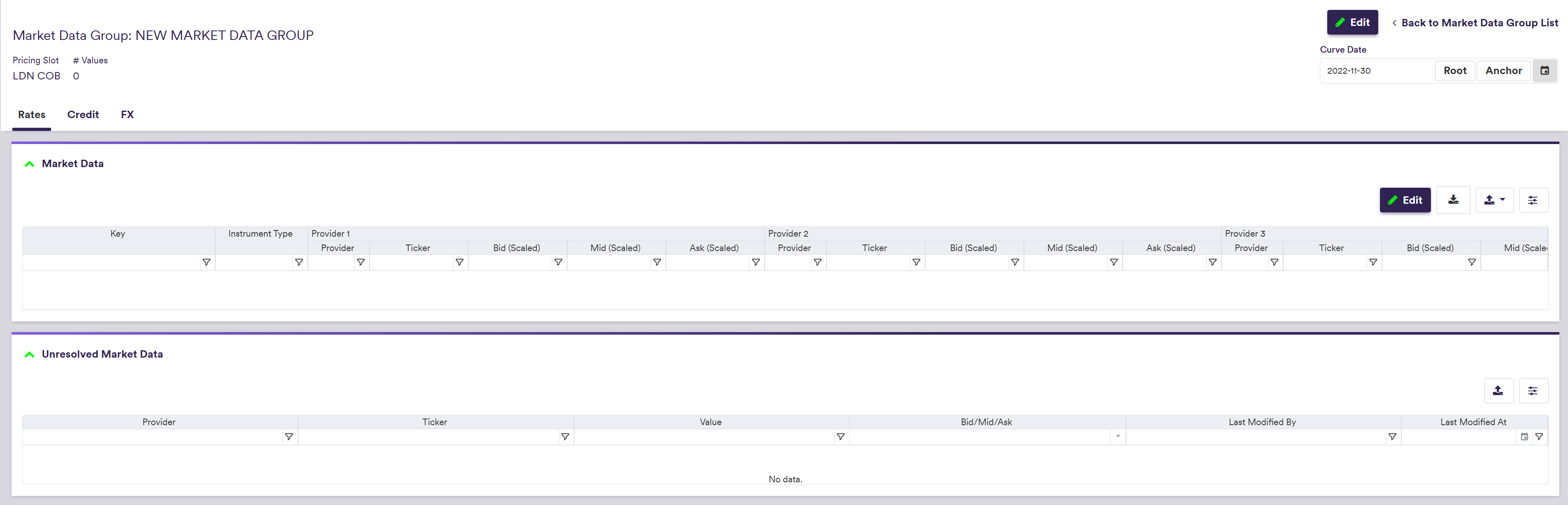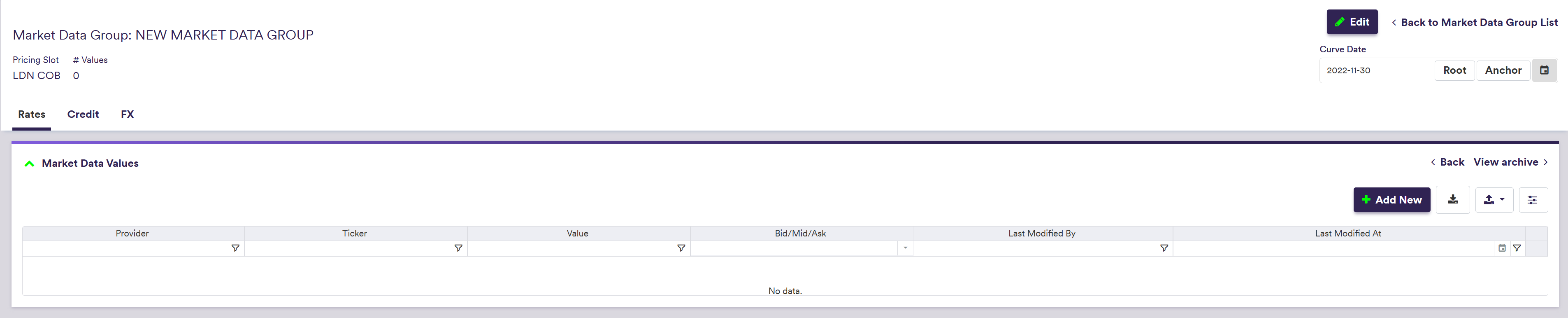 You can use for example the predefined ‘COB LONDON’ market data group, or define your own independently. This page will guide you through the process using an example: defining a ‘NEW Market Data GROUP’ that replicates ‘COB LONDON’. You can download the example .CSV data import files here.