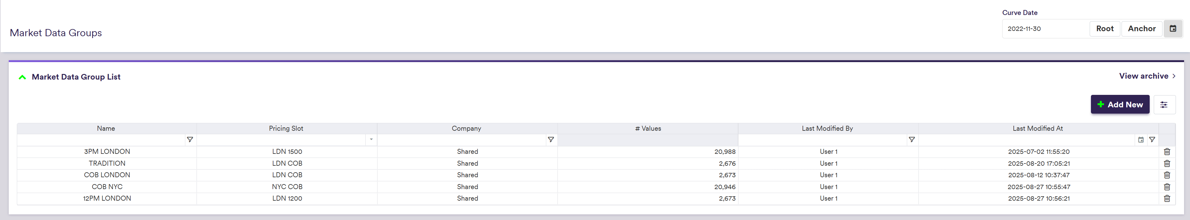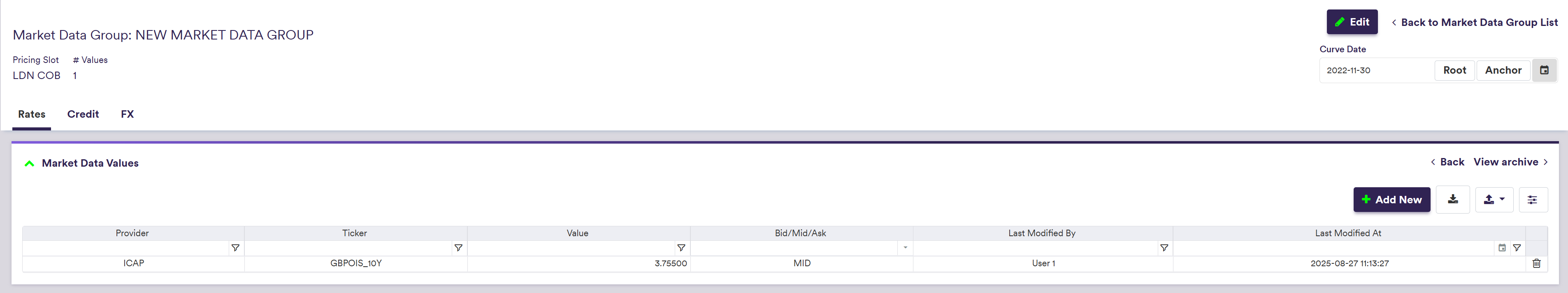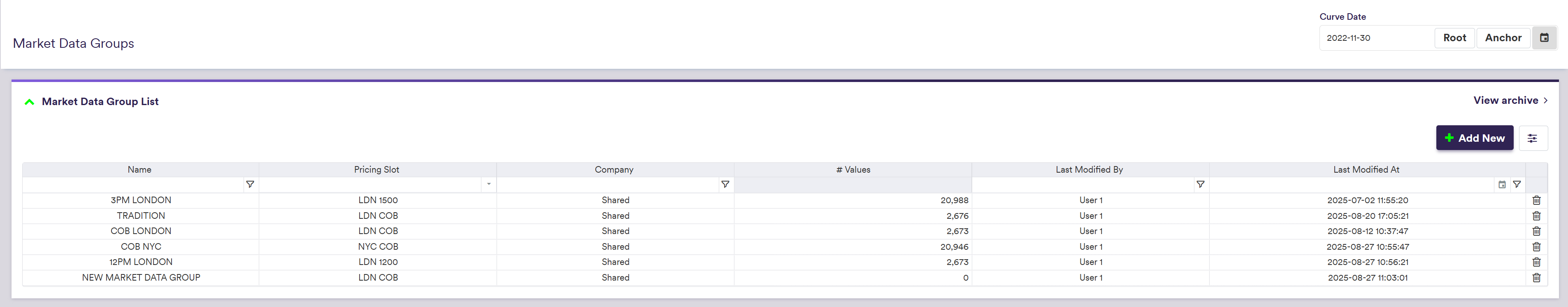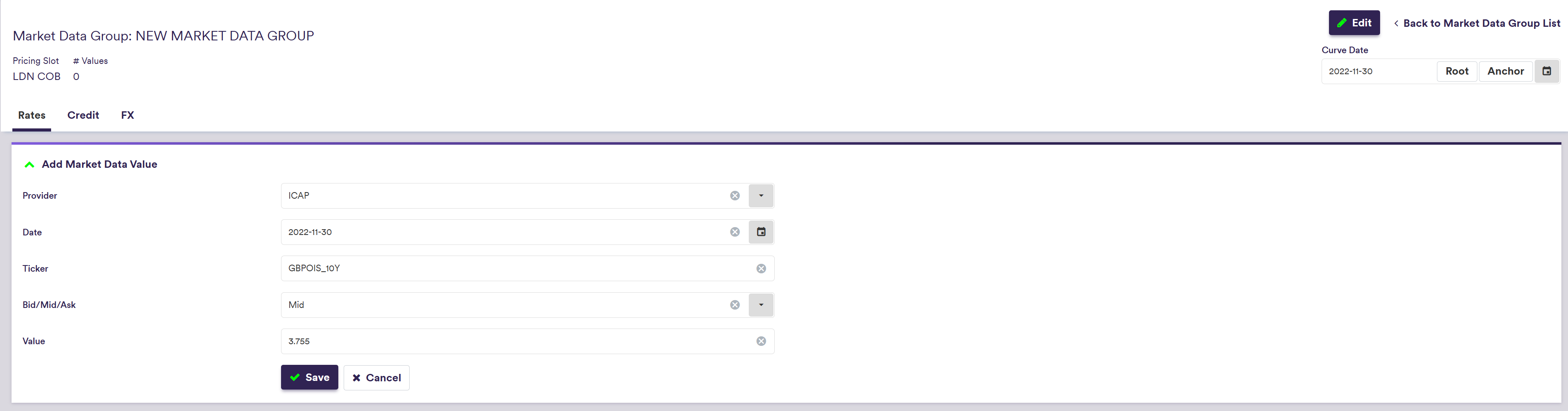 You can use for example the predefined ‘COB LONDON’ market data group, or define your own independently. This page will guide you through the process using an example: defining a ‘NEW Market Data GROUP’ that replicates ‘COB LONDON’. You can download the example .CSV data import files here.
