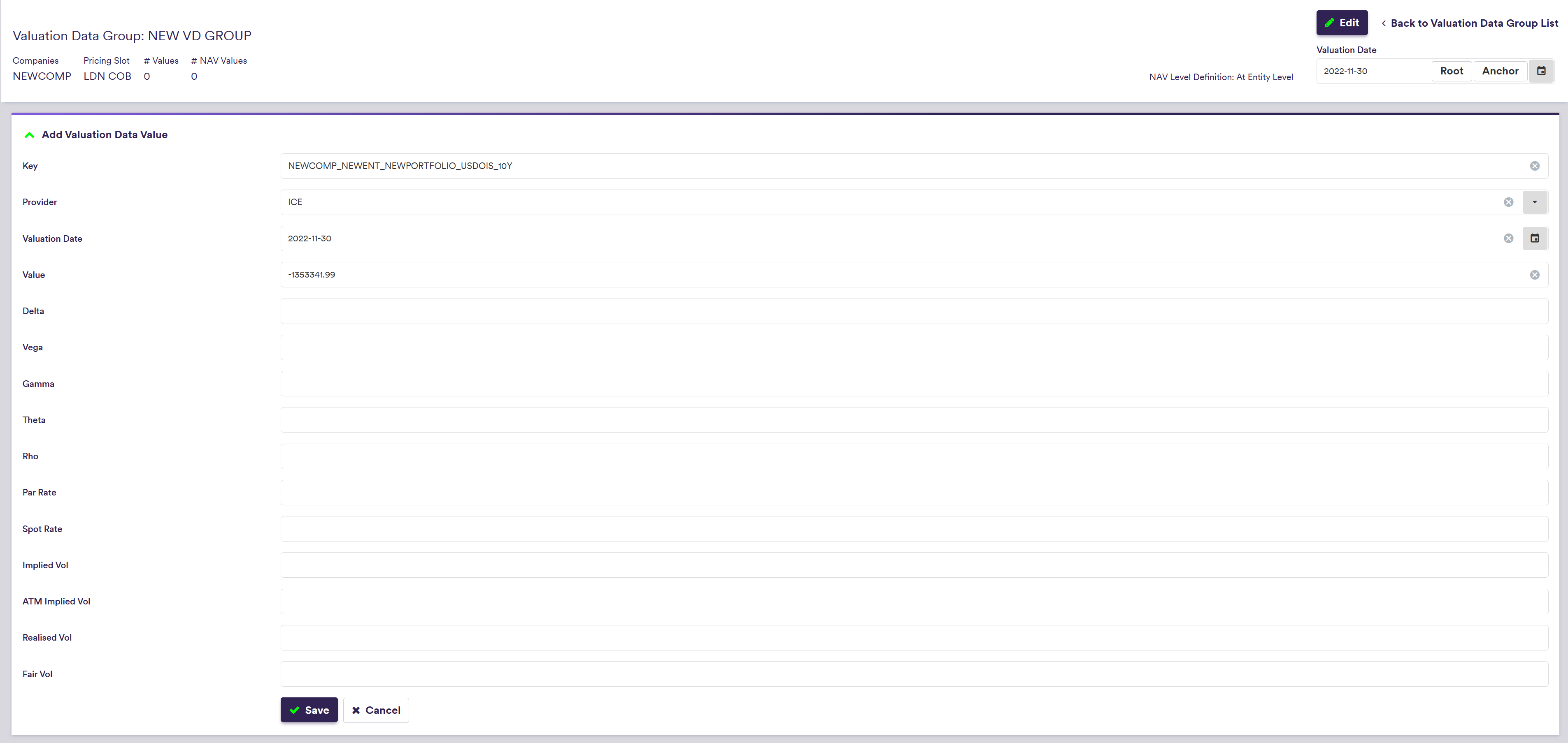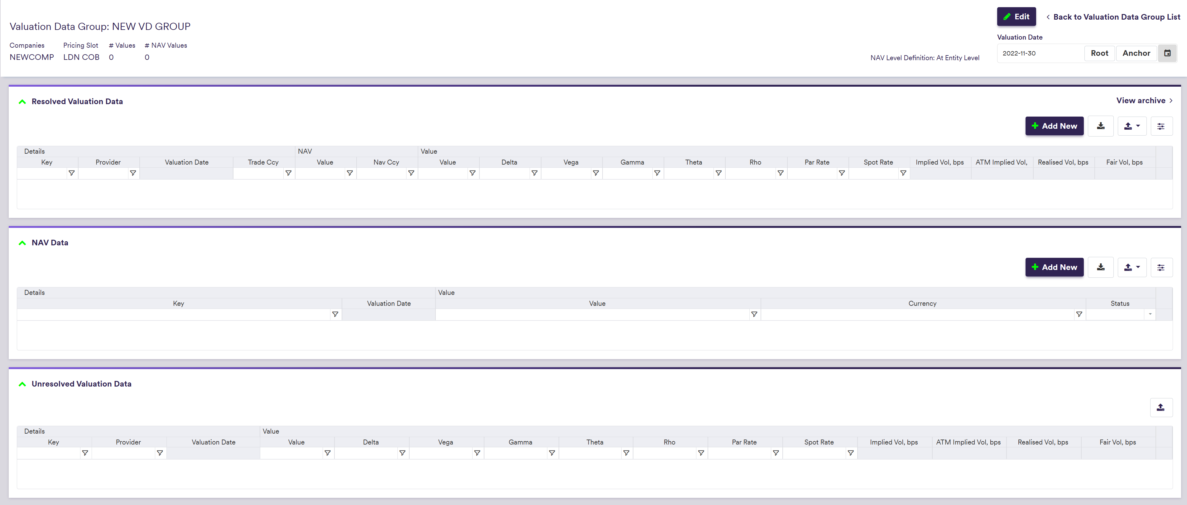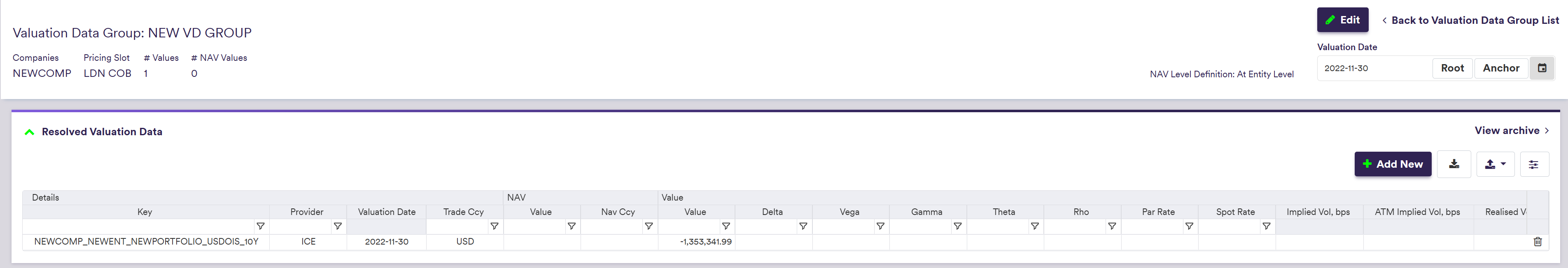 You can use for example the predefined ‘COB LONDON’ valuation data group, or define your own independently. This page will guide you through the process using an example: defining a ‘NEW VD GROUP’ that replicates ‘COB LONDON’. You can download the example .CSV data import files here.