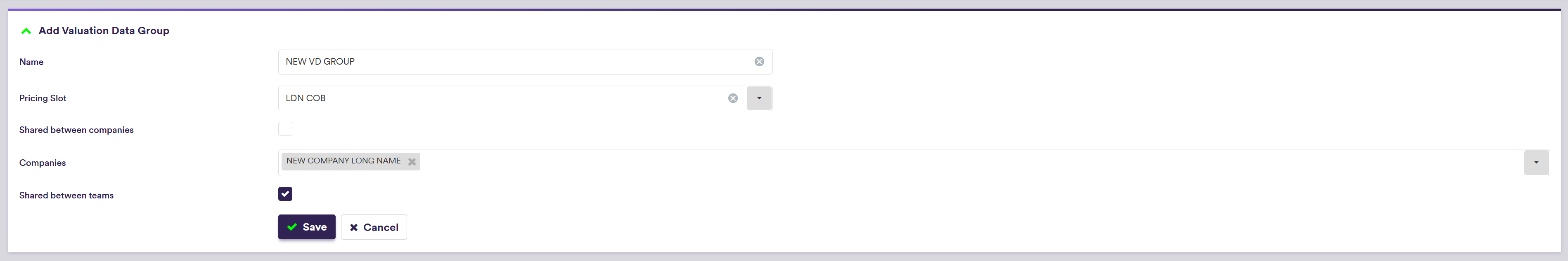 | Shared between teams | Whether the valuation data group will be accessible across all teams | Boolean |