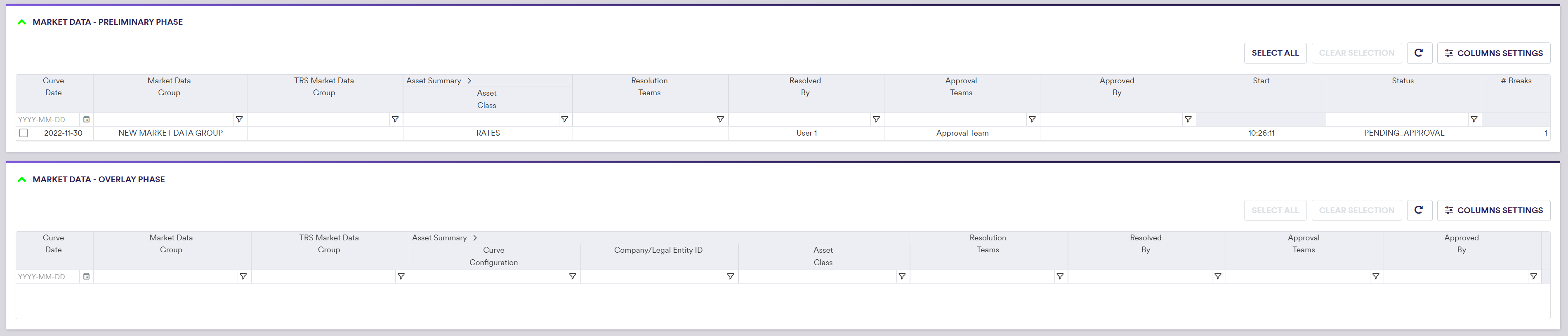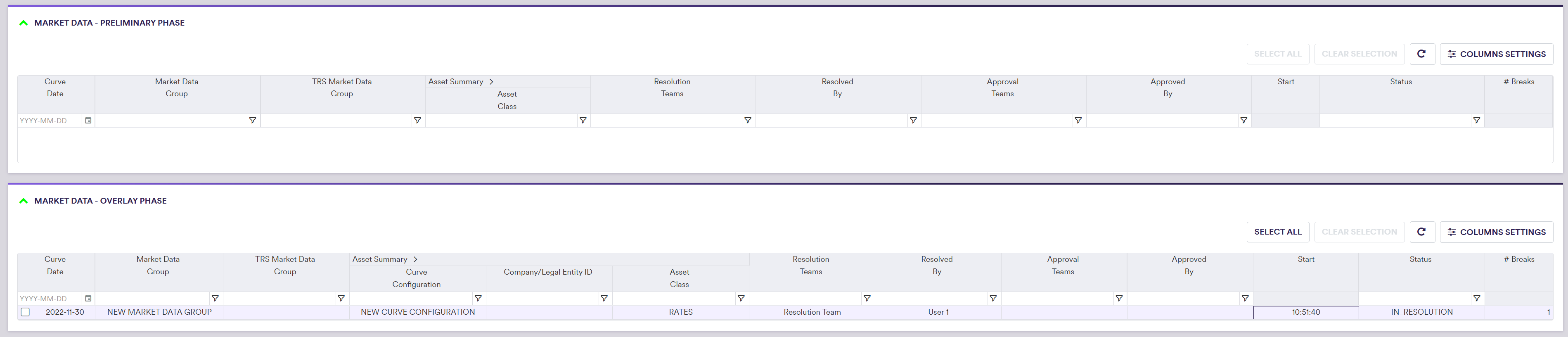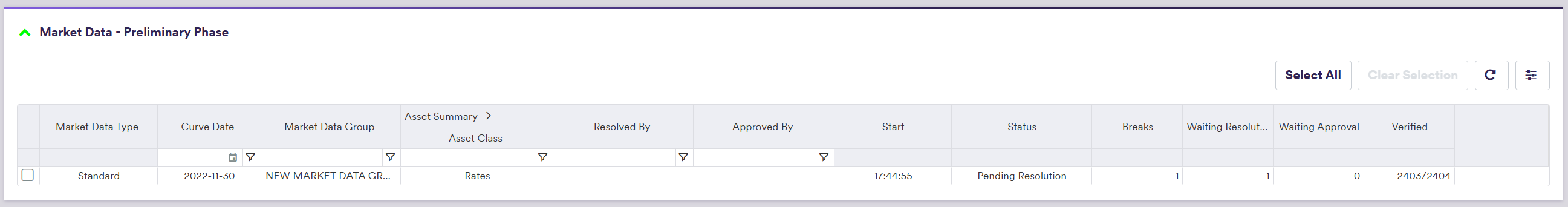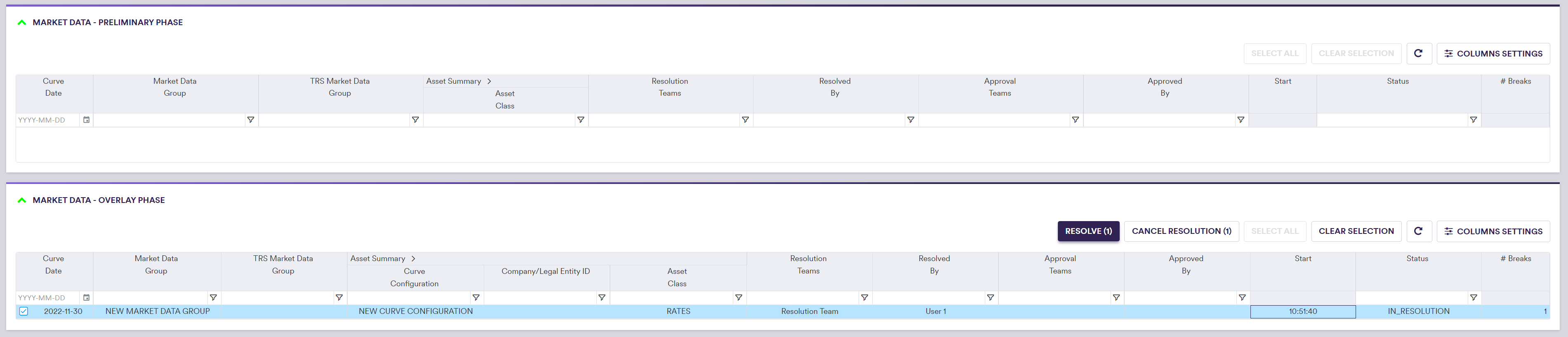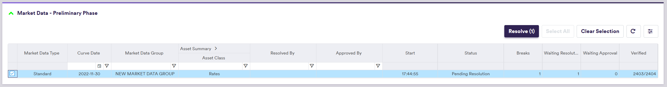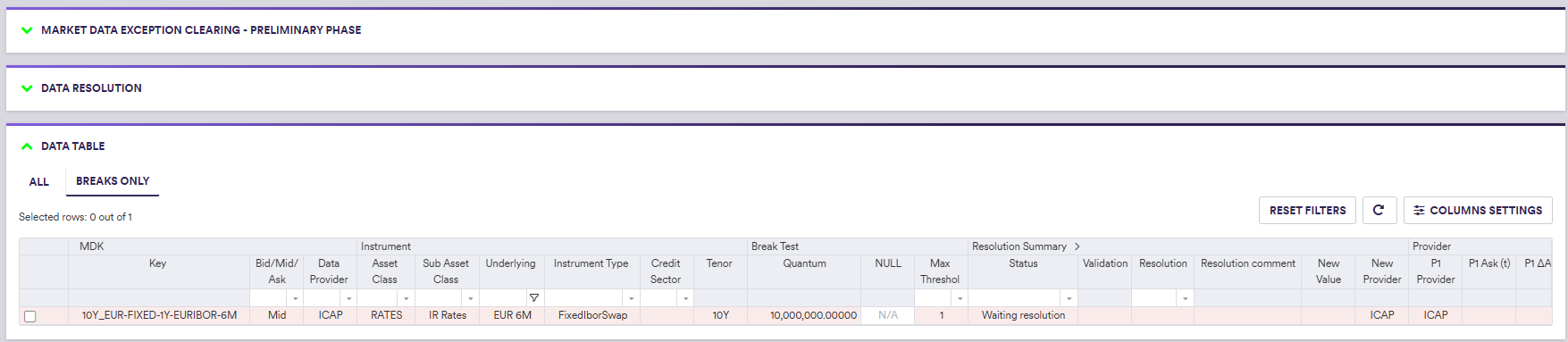 | Action | The proposed resolution to be applied to the filtered/selected items | See market data preliminary resolution actions below |