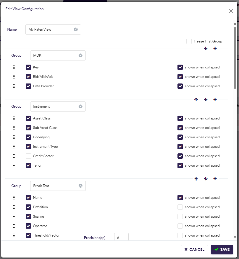 In addition, you can define and save your preferred display configuration. This helps to clear out any extra noise and allows you to focus on the columns that are relevant to you. For example, if you specialise in anomaly detection for rates, the credit sector column will not be relevant to you, and you are able to remove it from your view. Any bespoke views can only be edited or deleted by their creator.