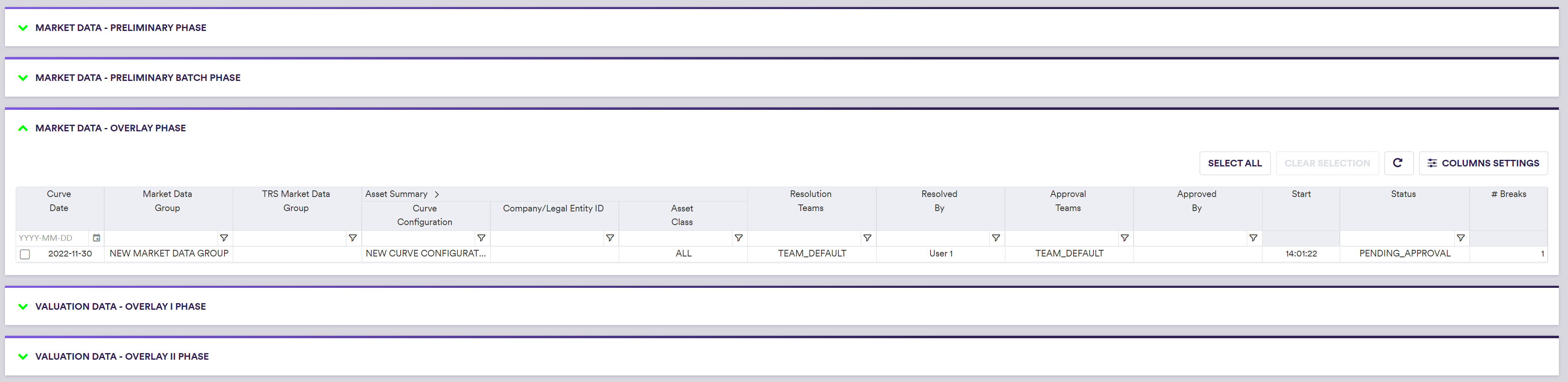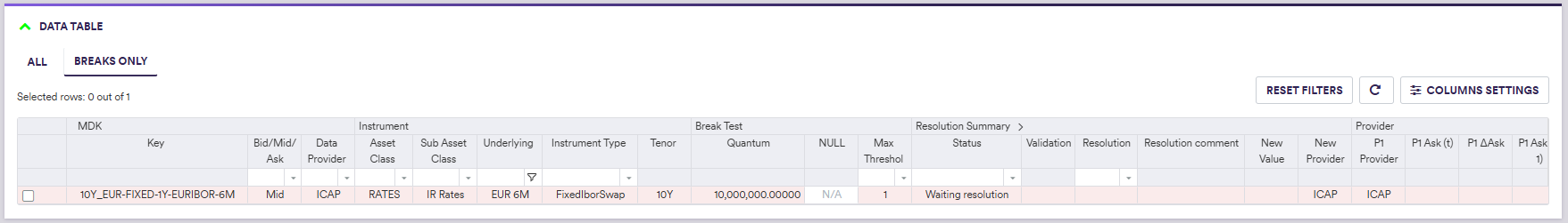In our example, we have a preliminary market data break (Quantum test) that you will resolve with the ‘Manual Override’ resolution action, followed by an overlay break (EUR IRS Source to Source test) that you will resolve with the ‘Keep’ resolution action. Both resolutions will need to be approved by a different user.