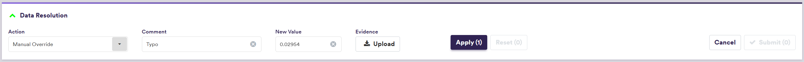 | Resolution Action | The proposed resolution to be applied to the filtered/selected items | See market data overlay resolution actions below |