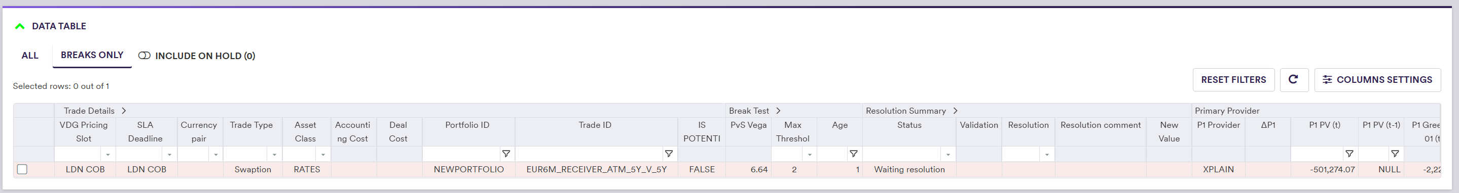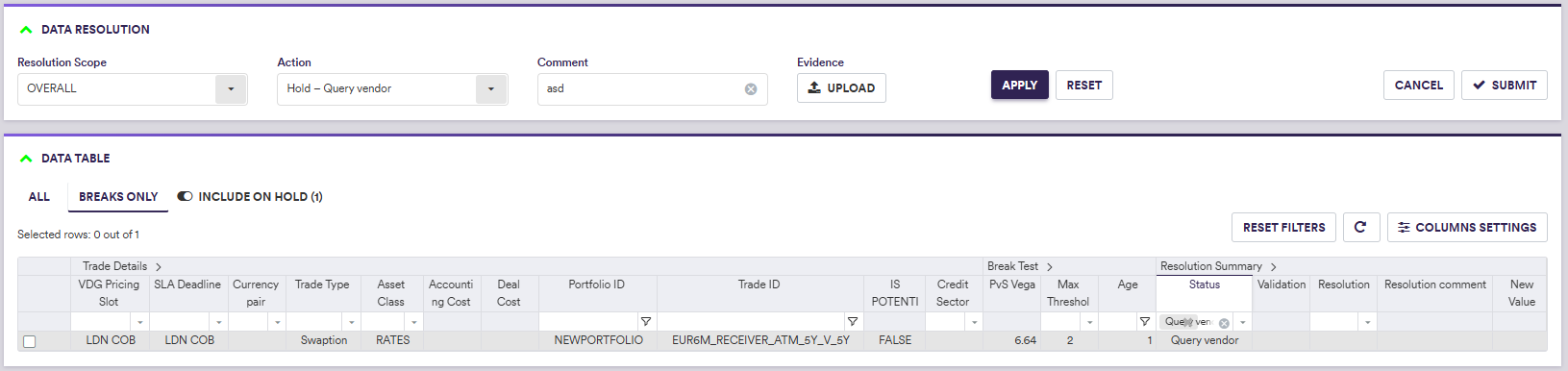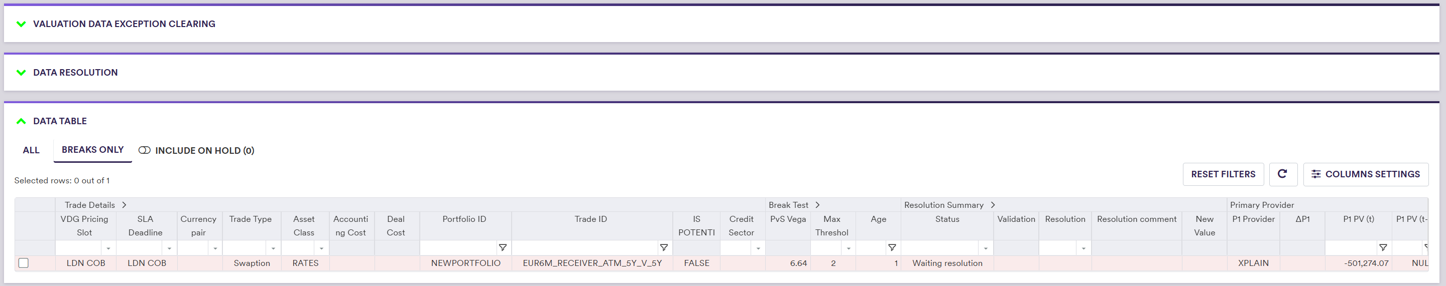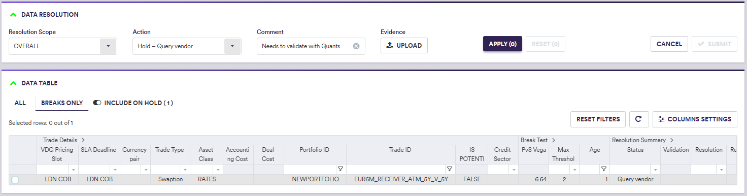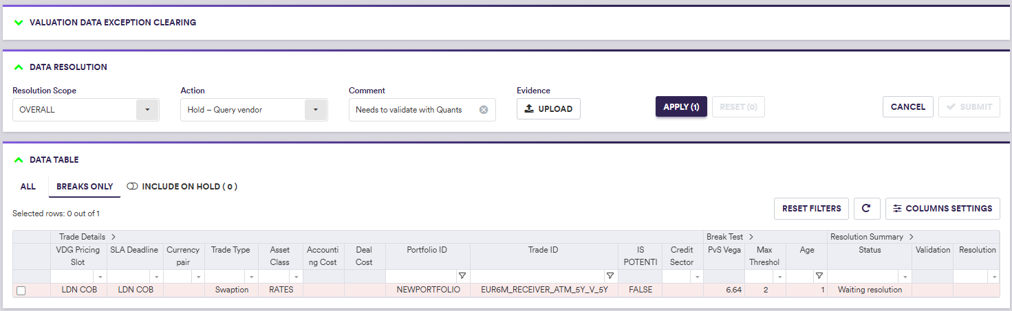 In our example, we do not have any Overlay I breaks and the VD XM goes straight to the Overlay II clearing phase. We have an Overlay II valuation data break (PvS Vega test) that you will first place on hold. You will then resolve the break with the ‘Switch to P2’ action, which will then need to be approved by a different user.