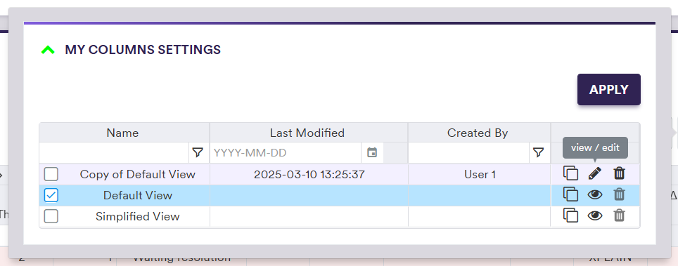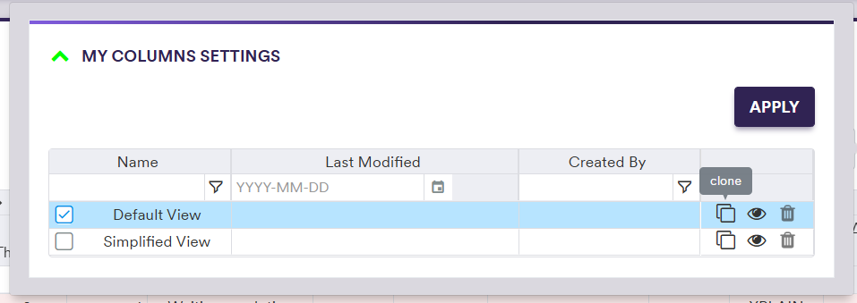 In the example below, you will go through configuring your own view, by cloning the ‘Default View’ and deselecting the ‘Credit Sector’ column.