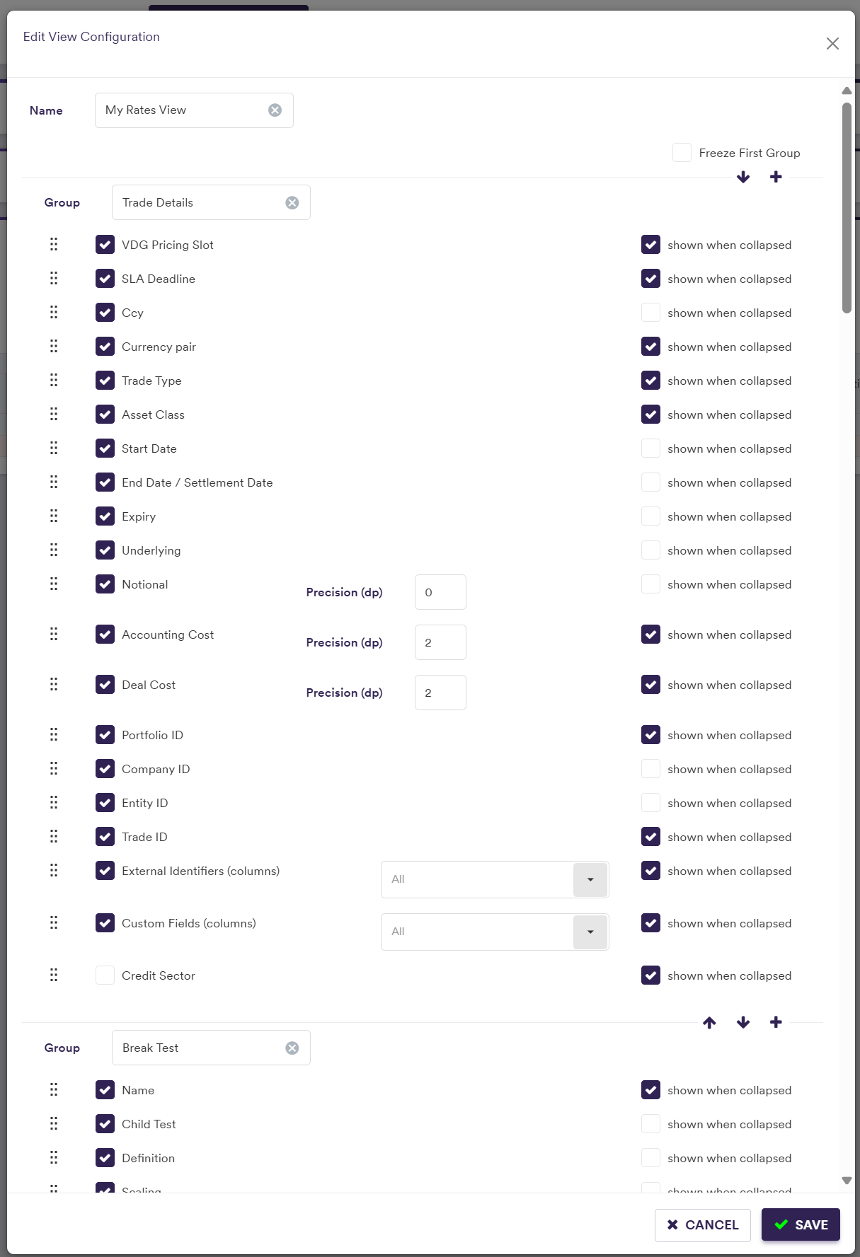 In addition, you can define and save your preferred display configuration. This helps to clear out any extra noise and allows you to focus on the columns that are relevant to you. For example, if you specialise in anomaly detection for rates, the credit sector column will not be relevant to you, and you are able to remove it from your view. Any bespoke views can only be edited or deleted by their creator.