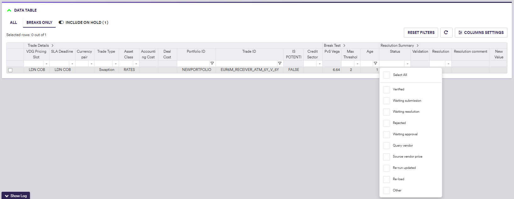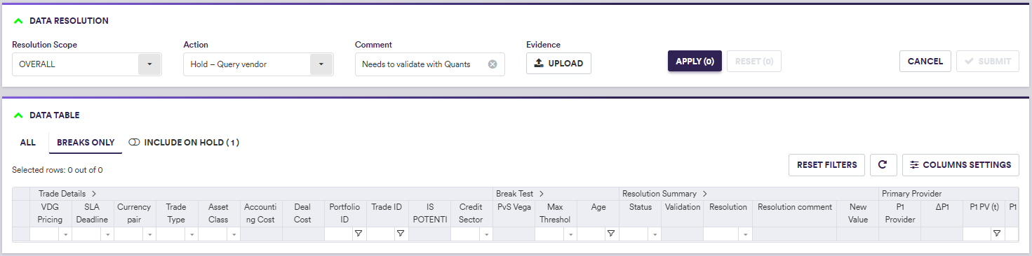 Now, the ‘Breaks Only’ view filter (which is the default view) will only display breaks that are awaiting resolution (in this example, none are left), but you can use the ‘INCLUDE ON HOLD’ toggle to include or exclude the ones that you have placed on hold. You should note that resolution actions will not be applied to items that have been placed on hold, even if the ‘INCLUDE ON HOLD’ toggle is activated.
