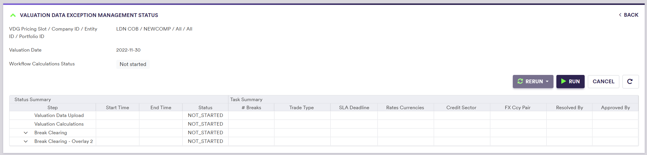 After loading the relevant valuation data, Xplain will perform break testing for the Overlay I and Overlay II break test phases, as described in the Valuation Data XM Break Testing section below. Any actual break will trigger a break clearing task (resolution and approval).