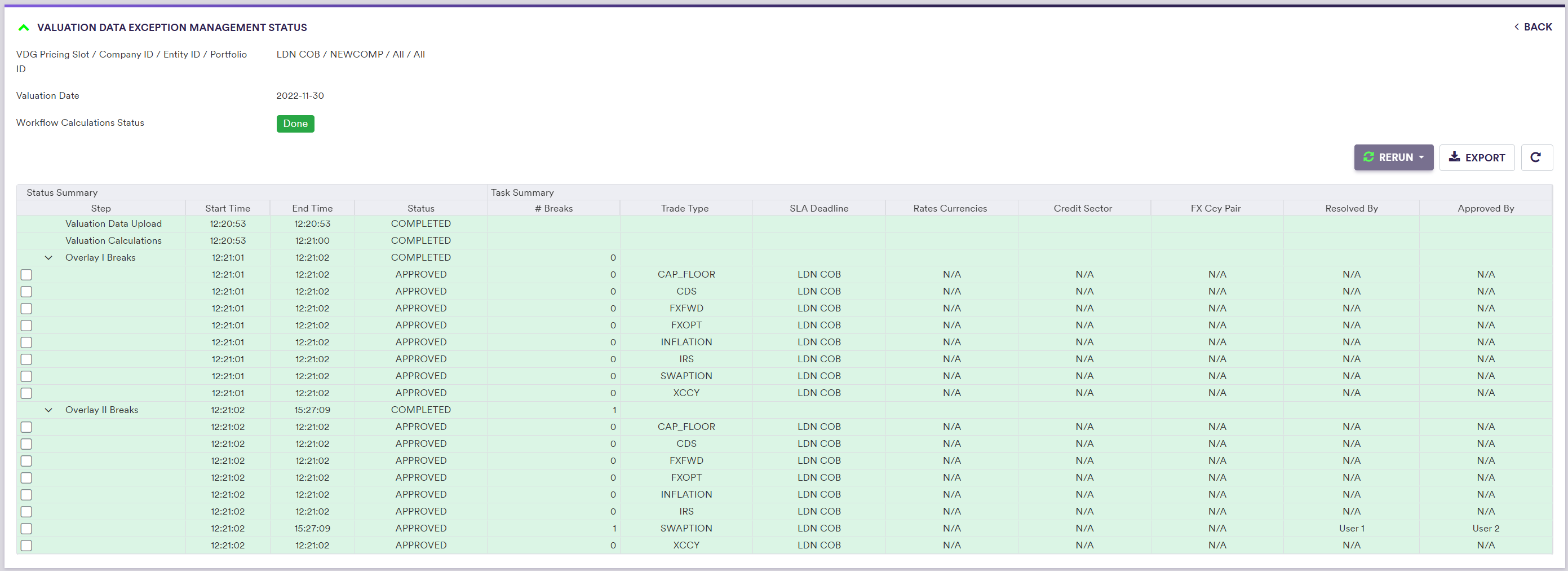 Once checked out, the status of the resolution task will go from ‘Pending Resolution’ to ‘In Resolution’. Following the first submission of a proposed resolution (as described in the Valuation Data Break Clearing - Resolver page), an approval task will be generated, that can also be checked out then. Likewise, once checked out, the status of the approval task will go from ‘Pending Approval’ to ‘In Approval’.