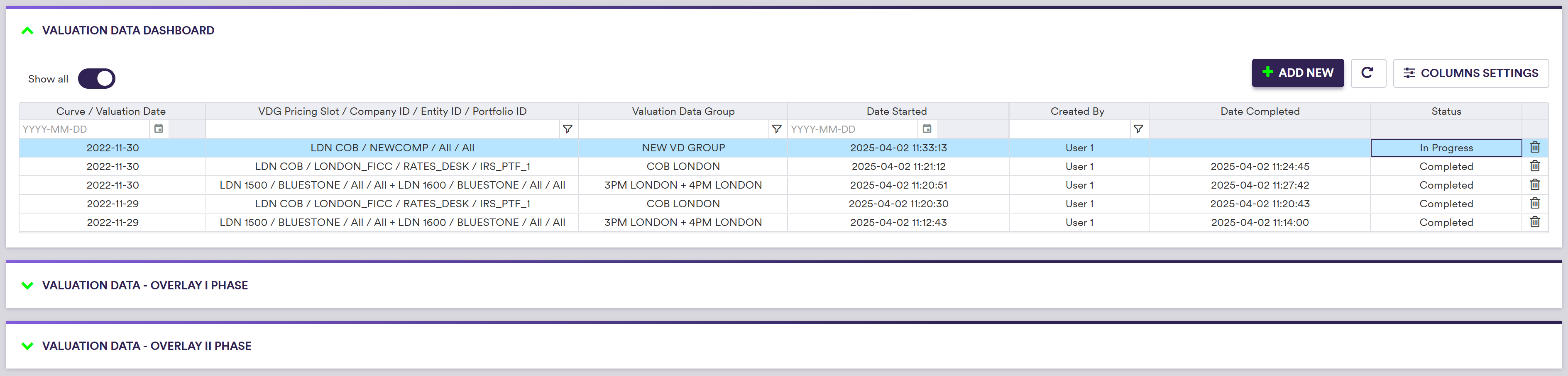 You can view a completed dashboard that was run for the ‘LDN 1500’ and ‘LDN 1600’ pricing slots in respect of all the portfolios belonging to the ‘BLUESTONE’ company, or one that was run for the ‘LDN COB’ pricing slot in respect of the ‘LONDON_FICC/RATES_DESK/IRS_PTF_1’ portfolio. Alternatively, you can replicate the completed ‘LDN COB’ dashboard by starting your own VD XM workflow.