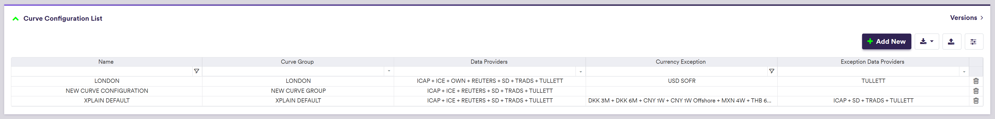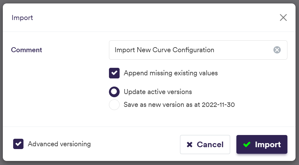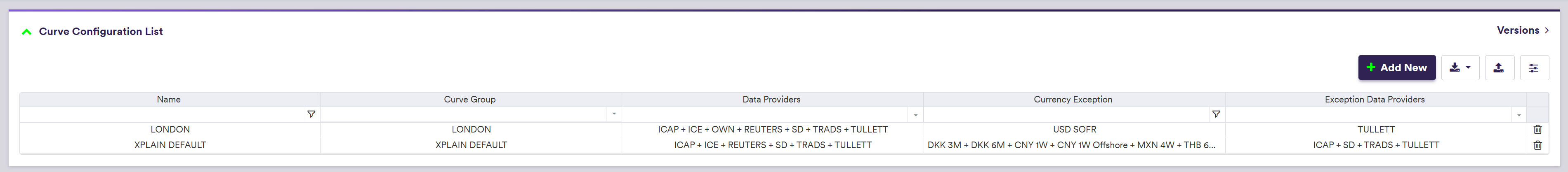 To import a curve configuration (or a list of curve configurations), click on (import) and select the relevant curve configuration definition .CSV import file.