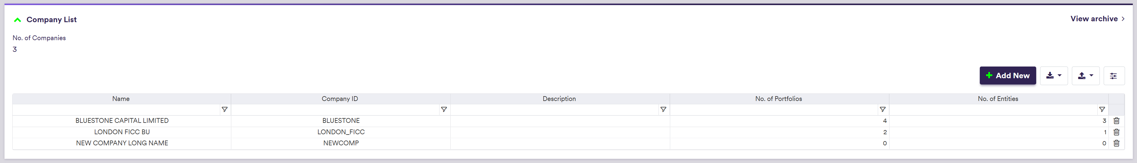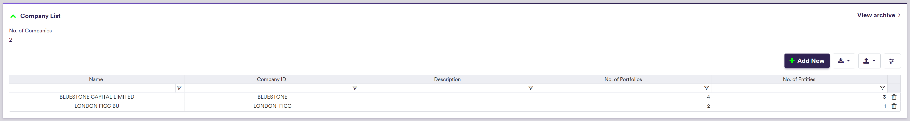 A company tree is defined by a company and its entities (and each entity’s trade portfolios). This can be used for instance to represent a client account and its funds, or a bank’s business unit and its trading desks.