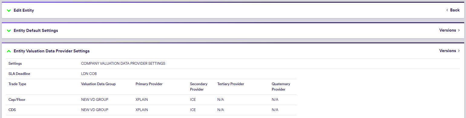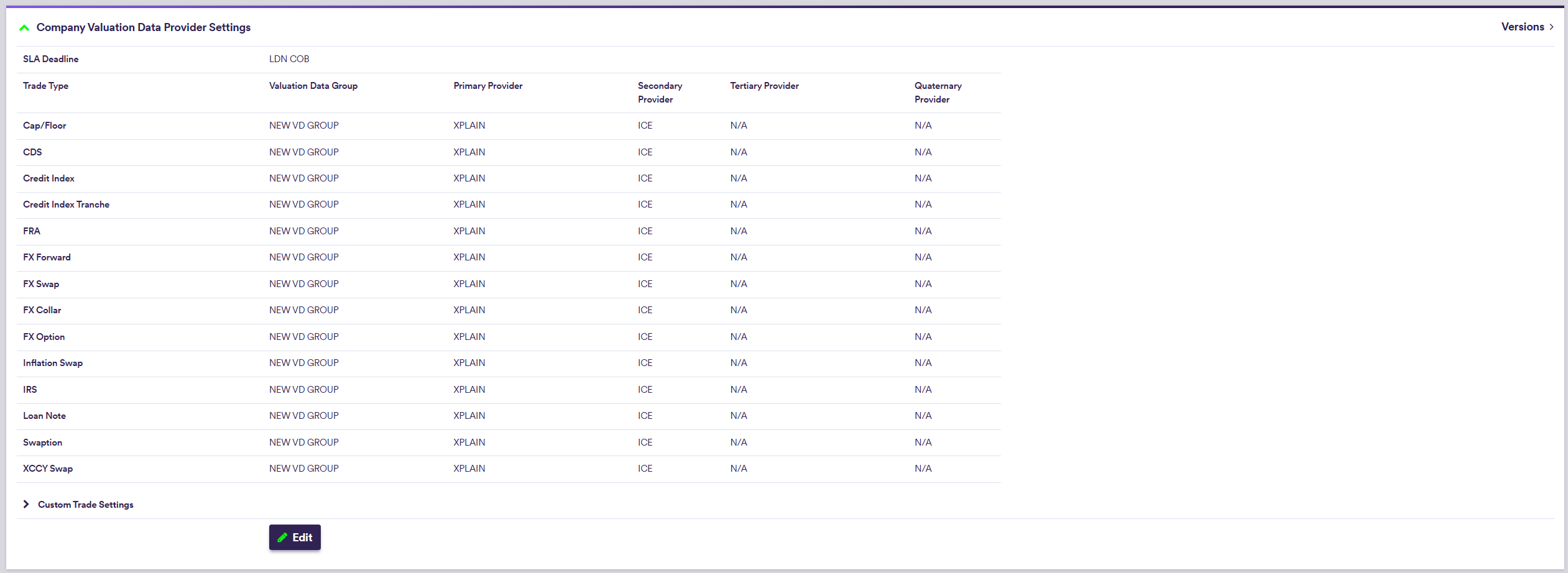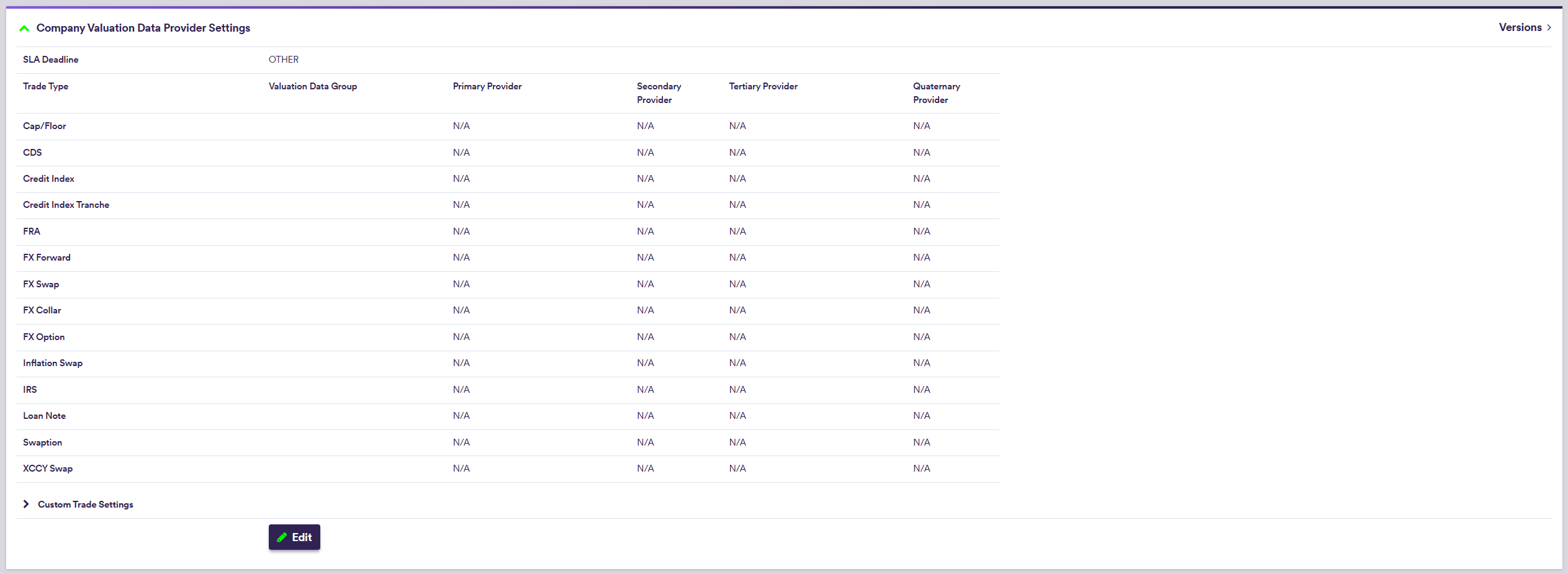 Default valuation data settings, which are only relevant for the purpose of valuation data anomaly detection, comprise SLA deadline time and, on a trade type basis, preferred valuation data group(s) and data providers (primary, secondary, tertiary and quaternary, as applicable).
