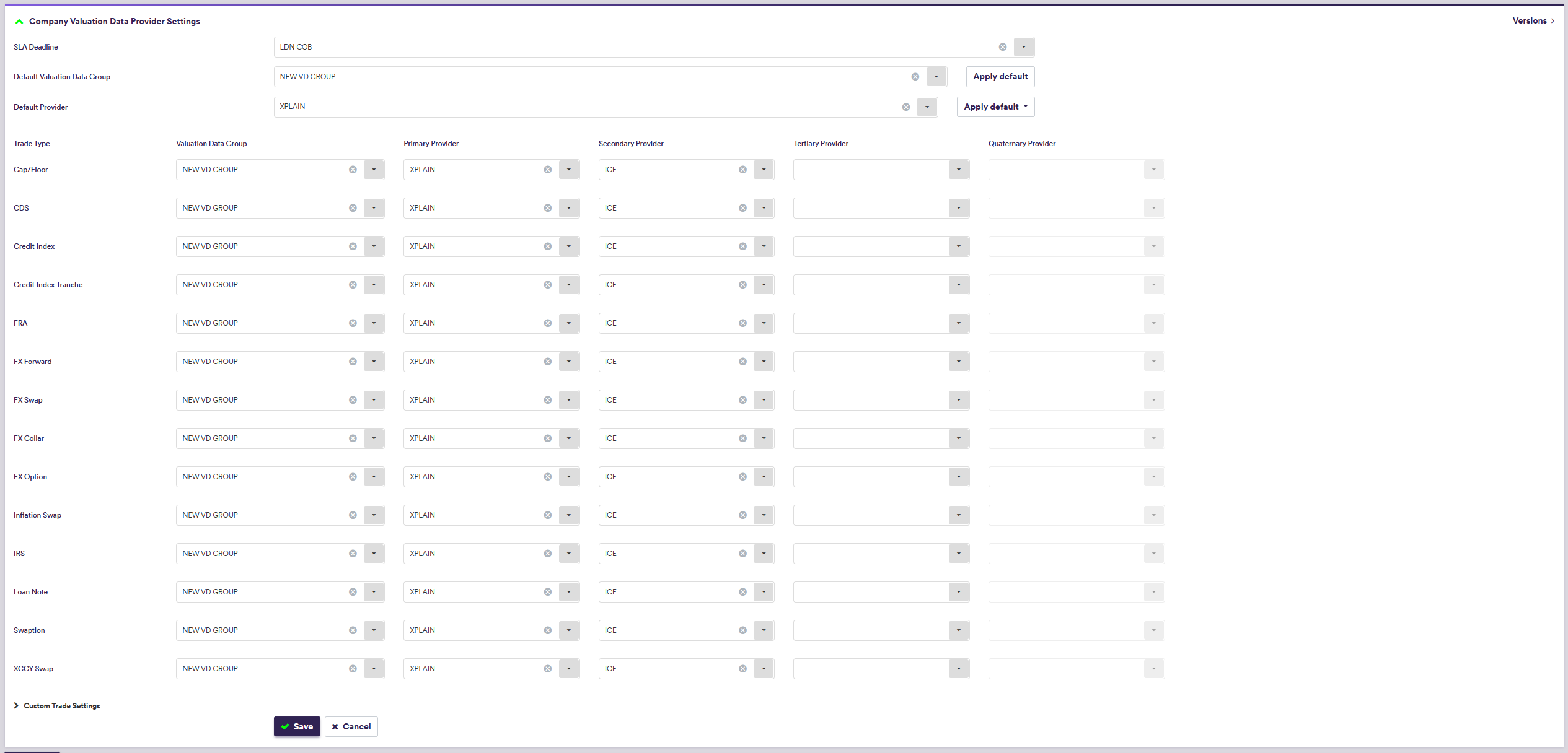 | Primary Provider | The default primary provider for valuation data for a given Trade Type (optional) | Any existing valuation data provider |