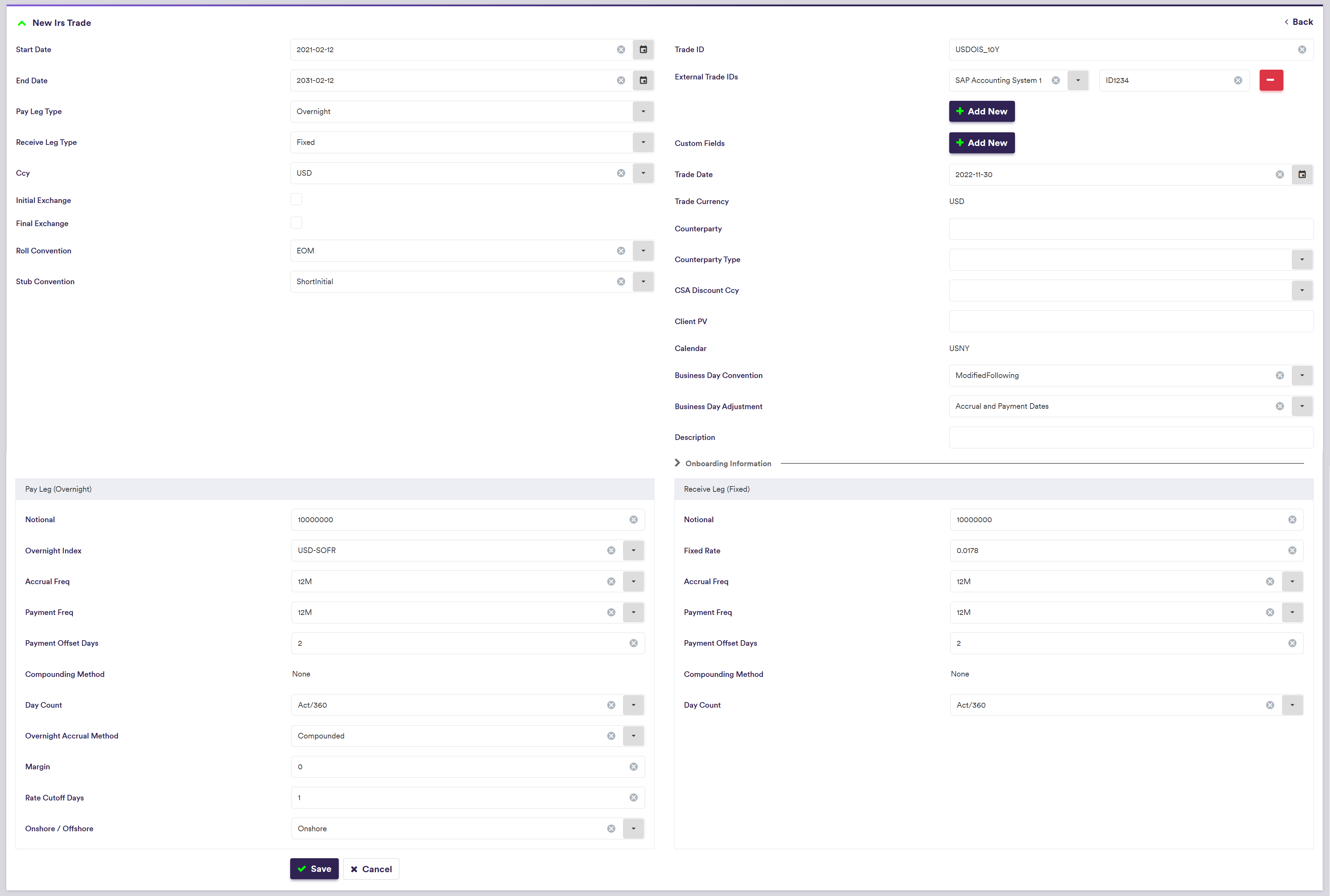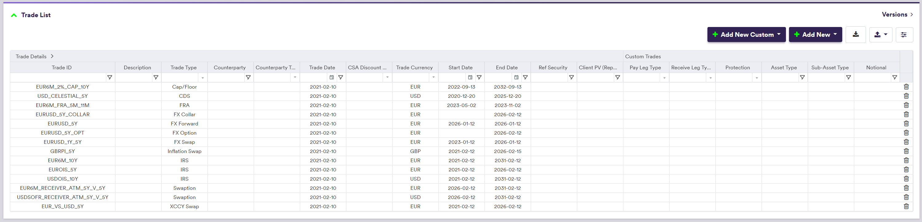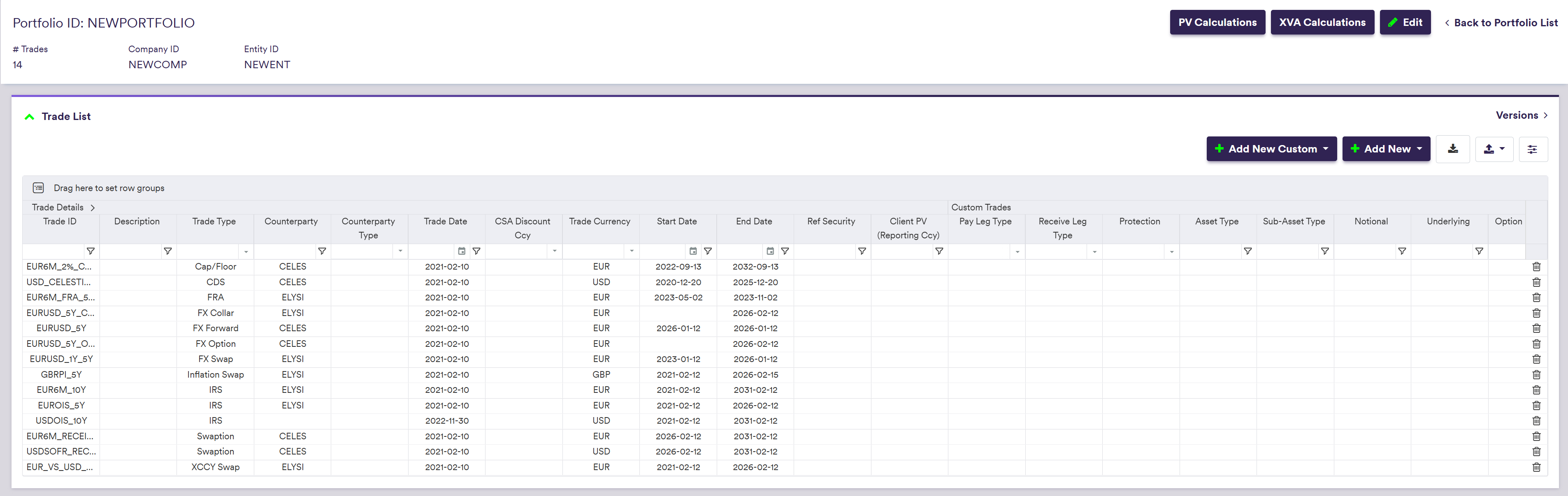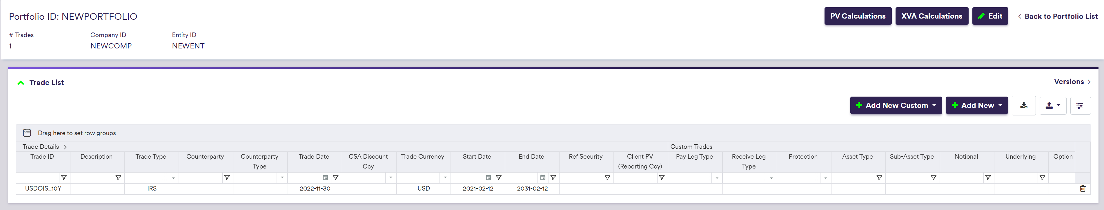 You can use the predefined ‘IRS_PTF_1’ portfolio, or define your own independently. This page will guide you through the process using an example: manually creating a ‘NEWPORTFOLIO’ that replicates ‘IRS_PTF_1’ with its underlying trades. For trade definition, we will use two examples: manually defining a ‘USDOIS_10Y’ IRS trade, or importing all the trades. You can download the example .CSV data import files here.
