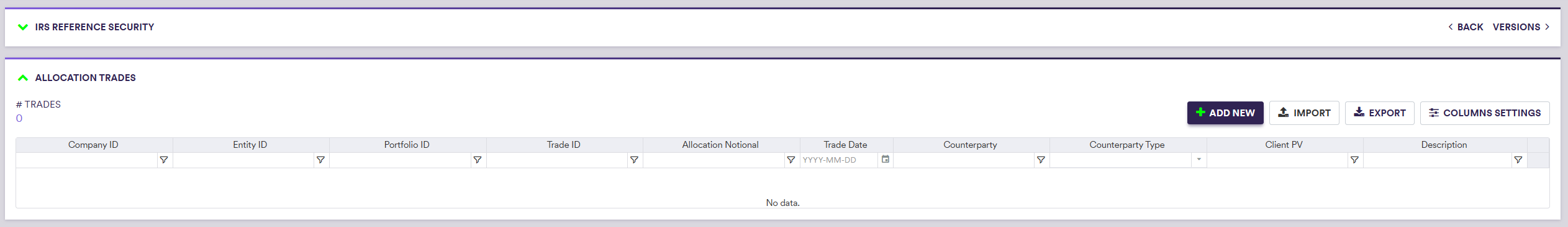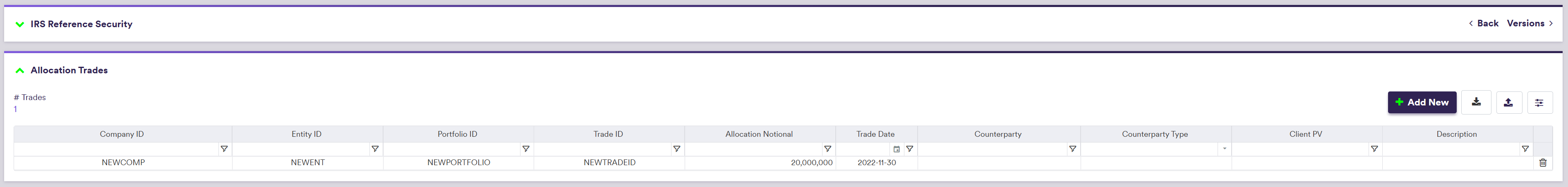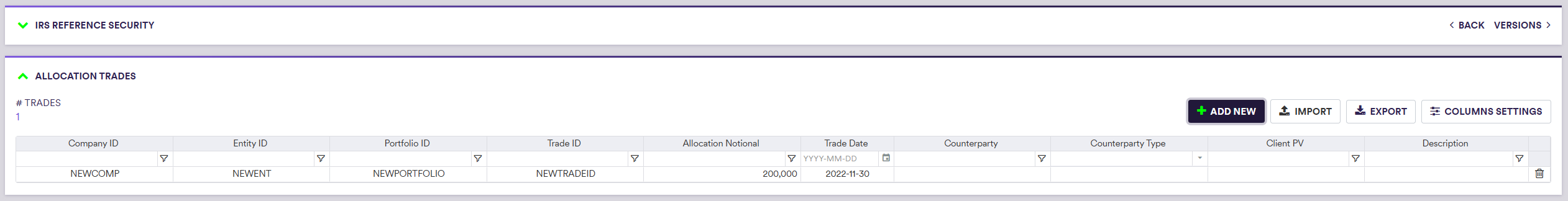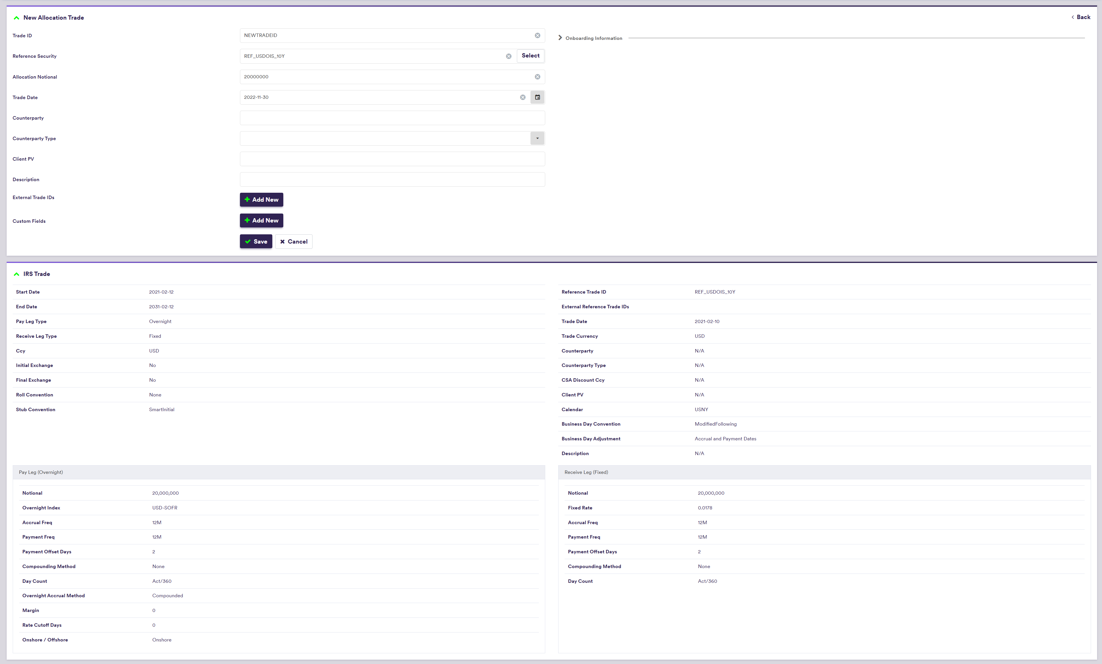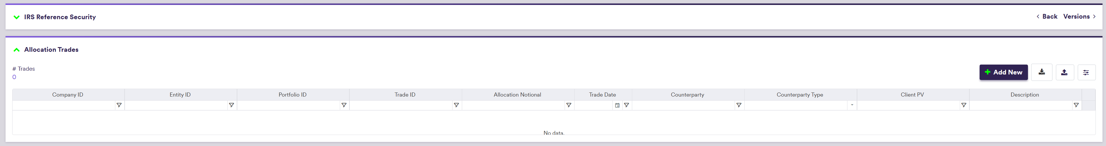 As an alternative to a standalone trade, you can define allocation trades (e.g. with different notionals or counterparties) by reference to a common reference security. You will first need to create a reference security by following a process similar to that of a standalone trade.