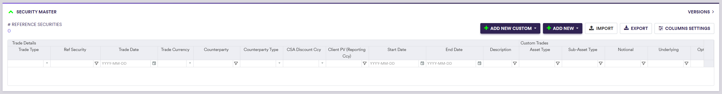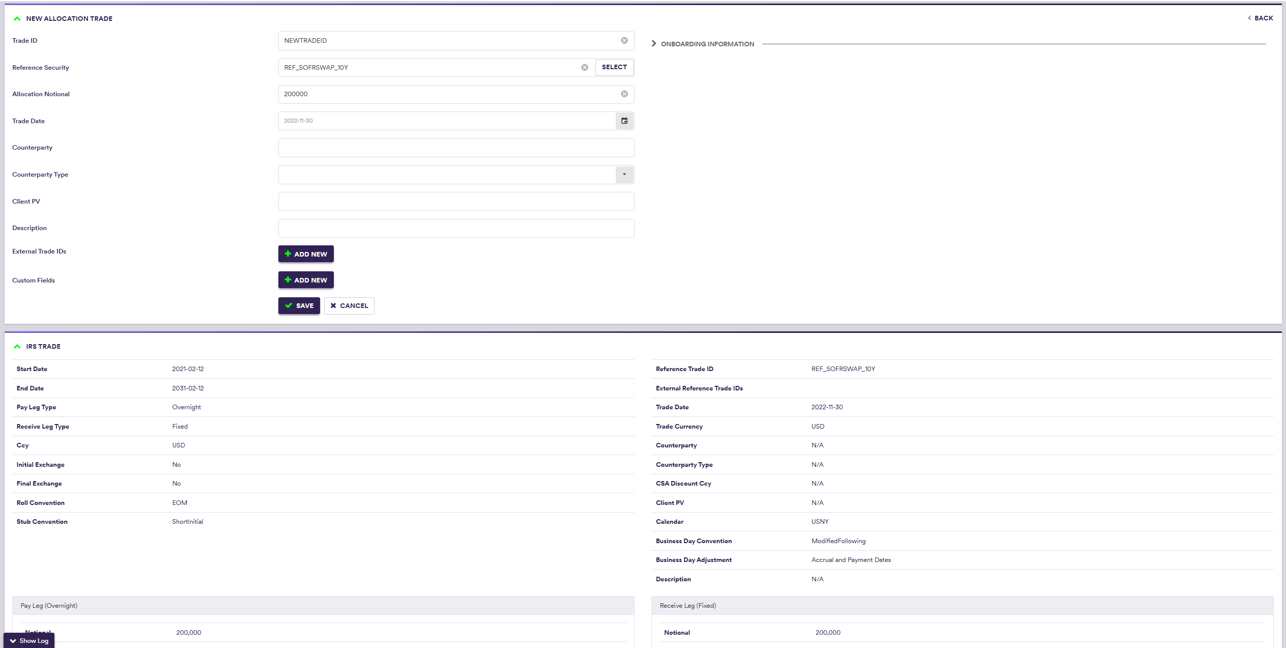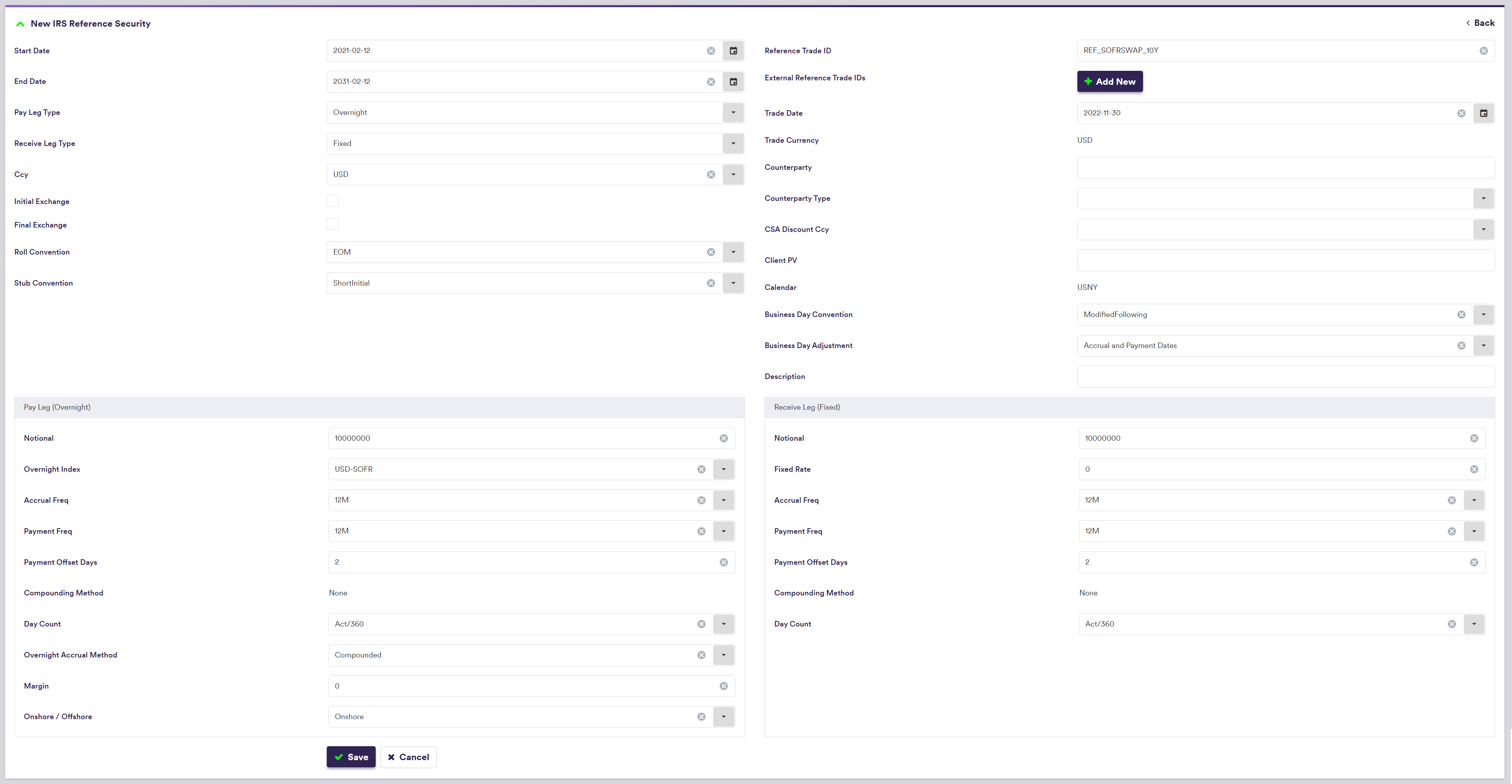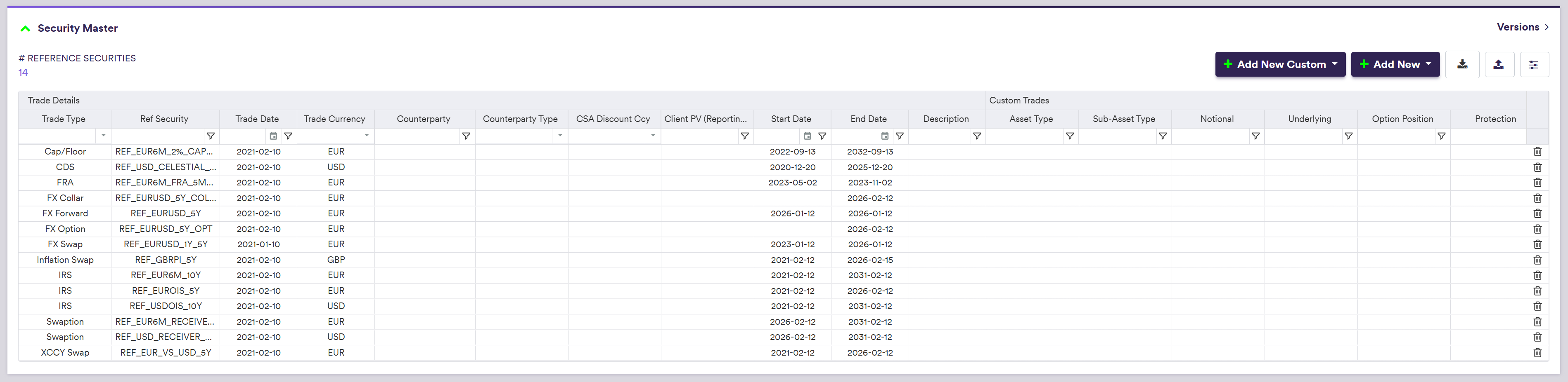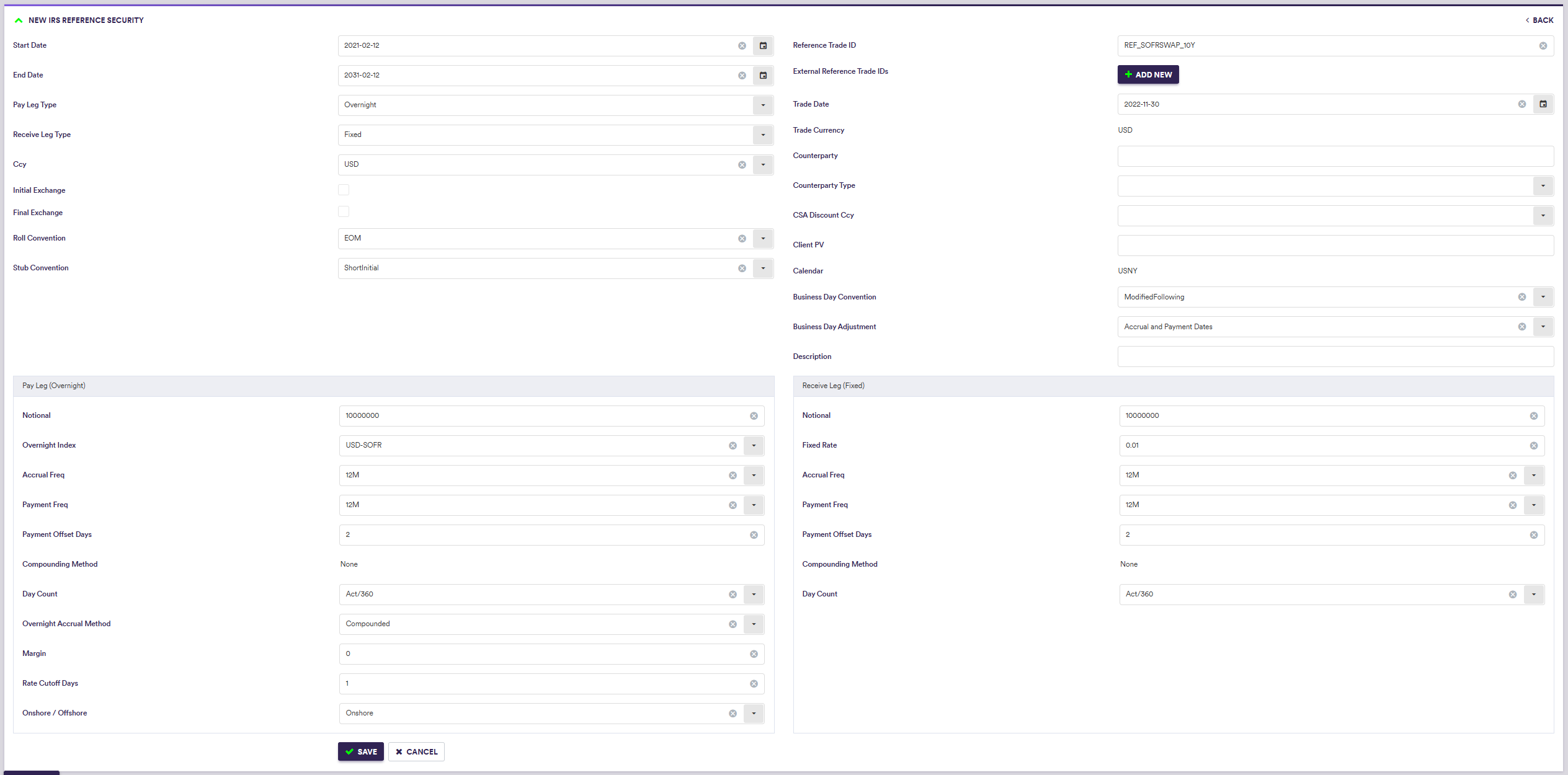 As an alternative to a standalone trade, you can define allocation trades (e.g. with different notionals or counterparties) by reference to a common reference security. You will first need to create a reference security by following a process similar to that of a standalone trade.