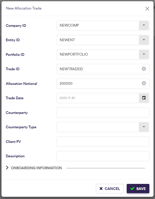 Onboarding Information | Trade onboarding data and requirements | See Trade Onboarding | O |