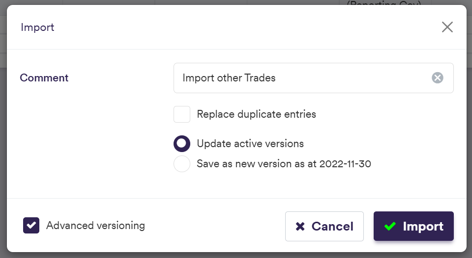 To import a trade (or a list of trades), click on (import) at the trade list level (or globally at the portfolio list level) and select the relevant trade list definition .CSV import file.