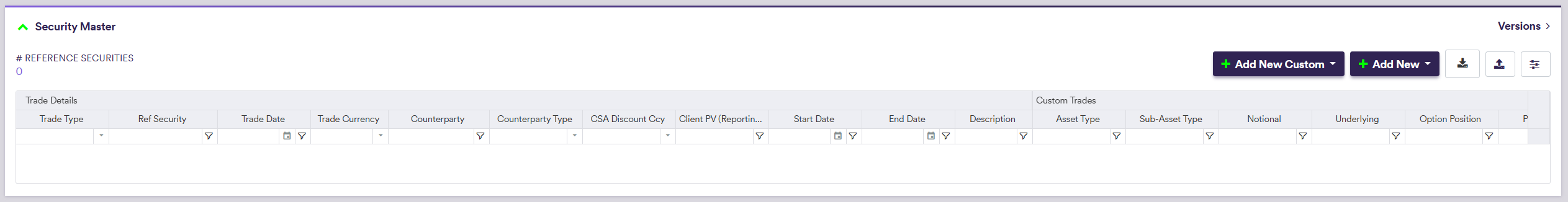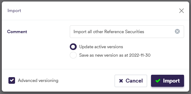 To import a reference security (or a list of reference securities), click on (import) and select the relevant reference security list definition .CSV import file.