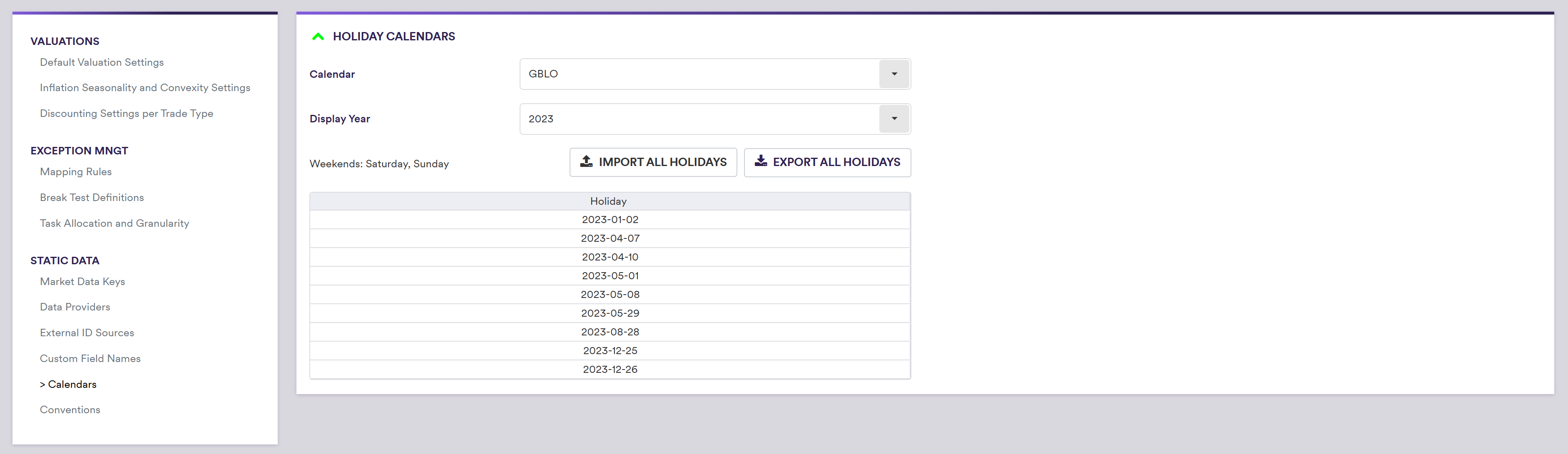 You can select the Calendar and Year, or alternatively download a list of all holidays for the selected Calendar by clicking on Export All HOLIDAYS.