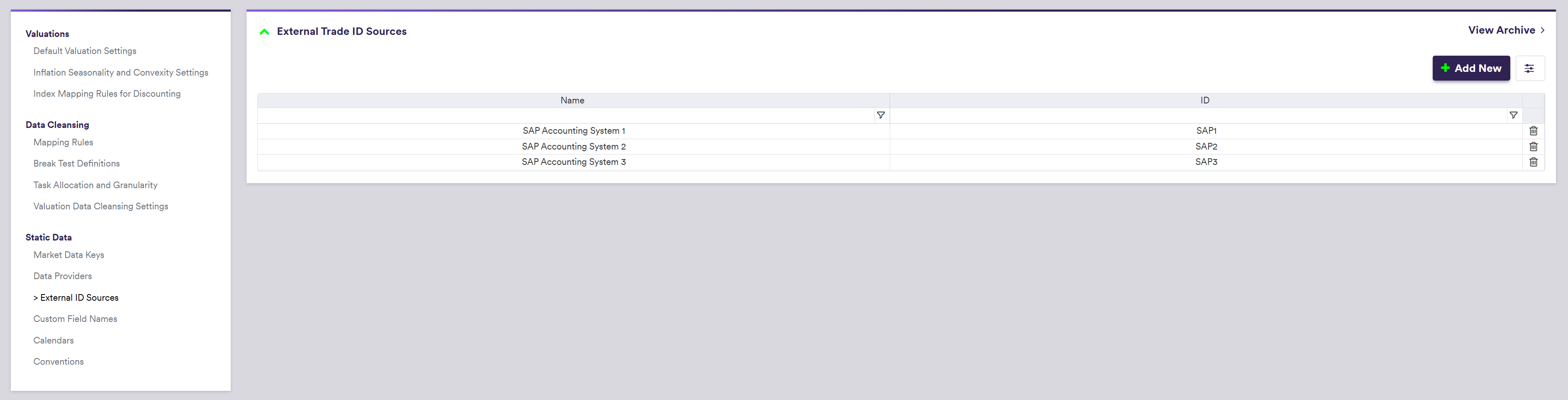 You can add to a trade multiple trade IDs related to different external systems. Bespoke external Trade ID sources need to be defined first.