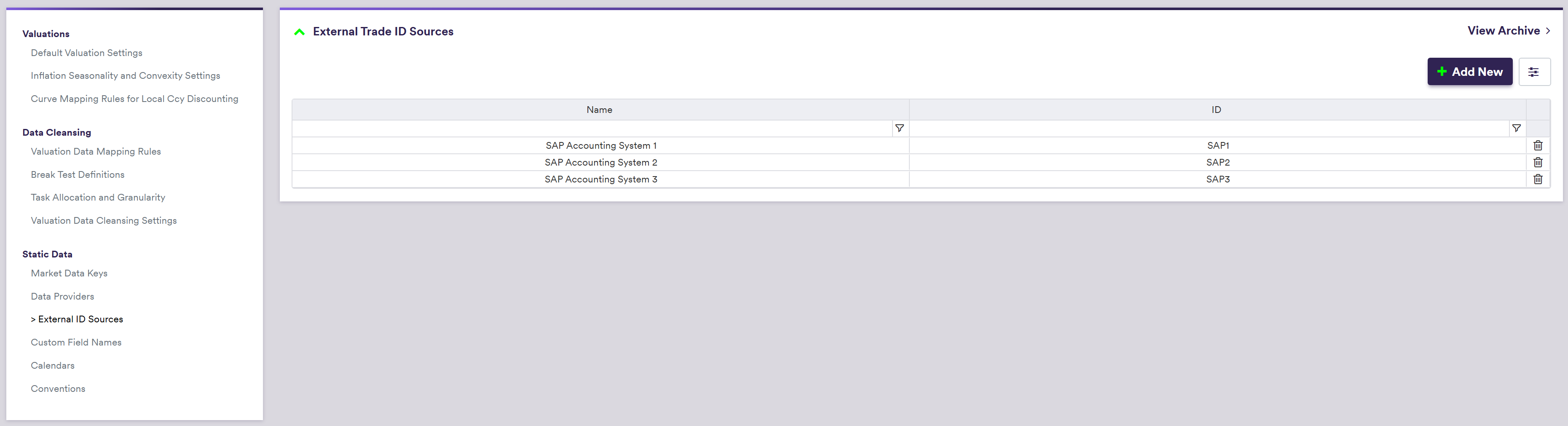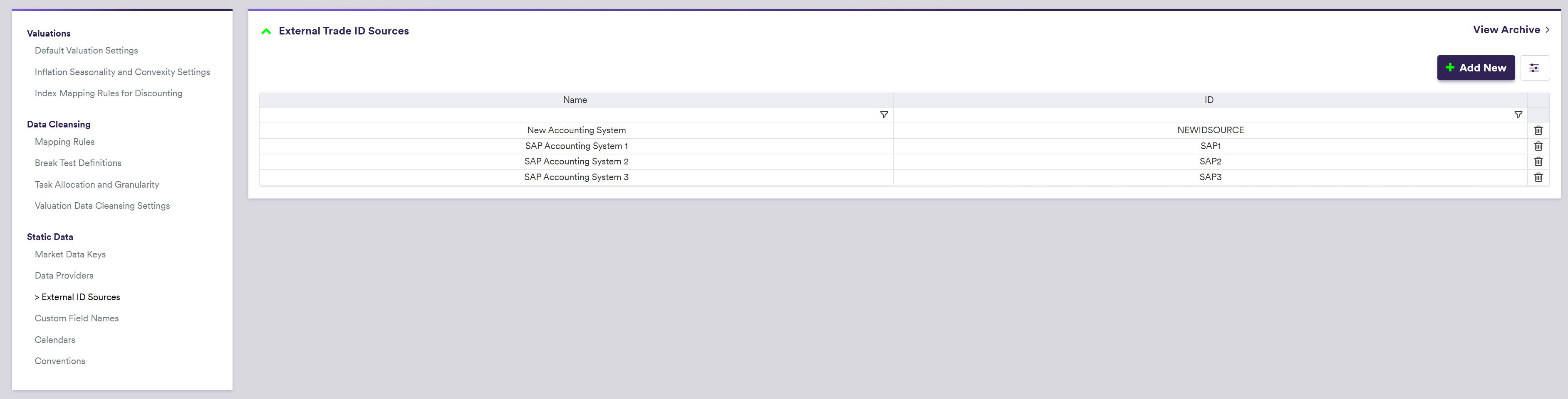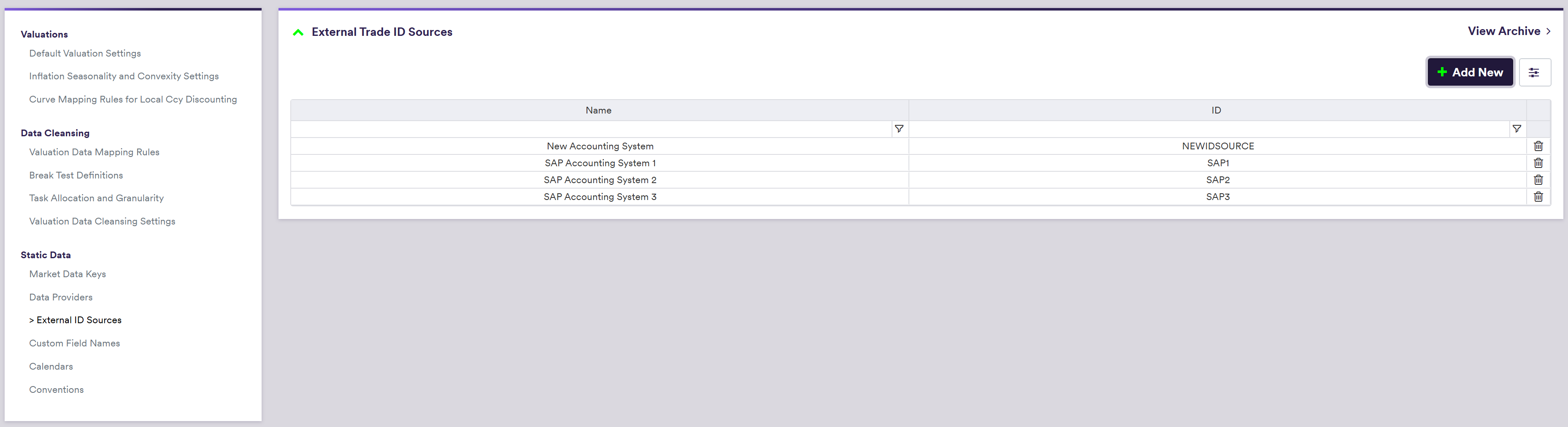 Under Data/Static Data/ID Source, at the external trade ID source list level, you can create a identifier source by clicking on Add New (or edit an existing one by double-clicking on the line item).