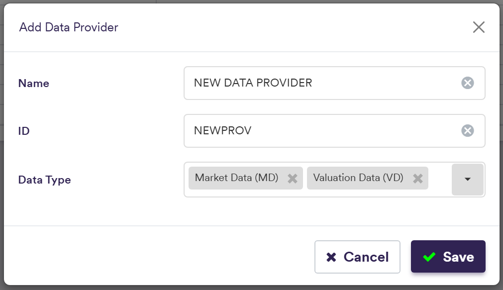 | Data Type | The data type: market data and/or valuation data | Market Data (MD) | Valuation Data (VD) |