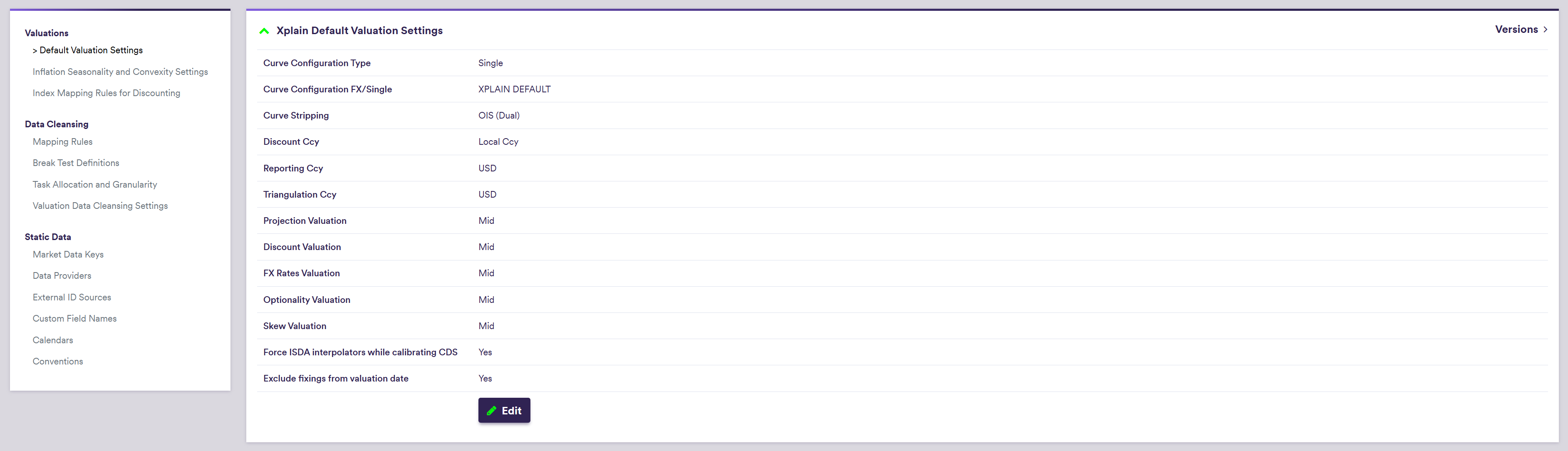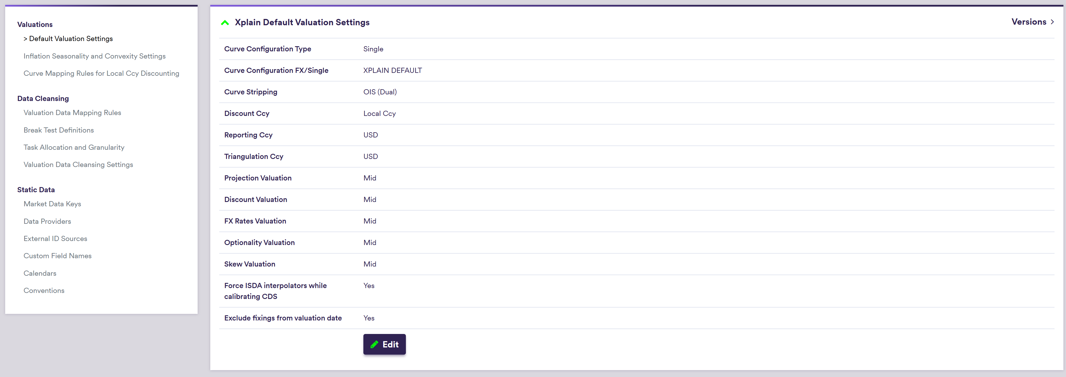 - global default valuation settings, to define Xplain’s default valuation parameters