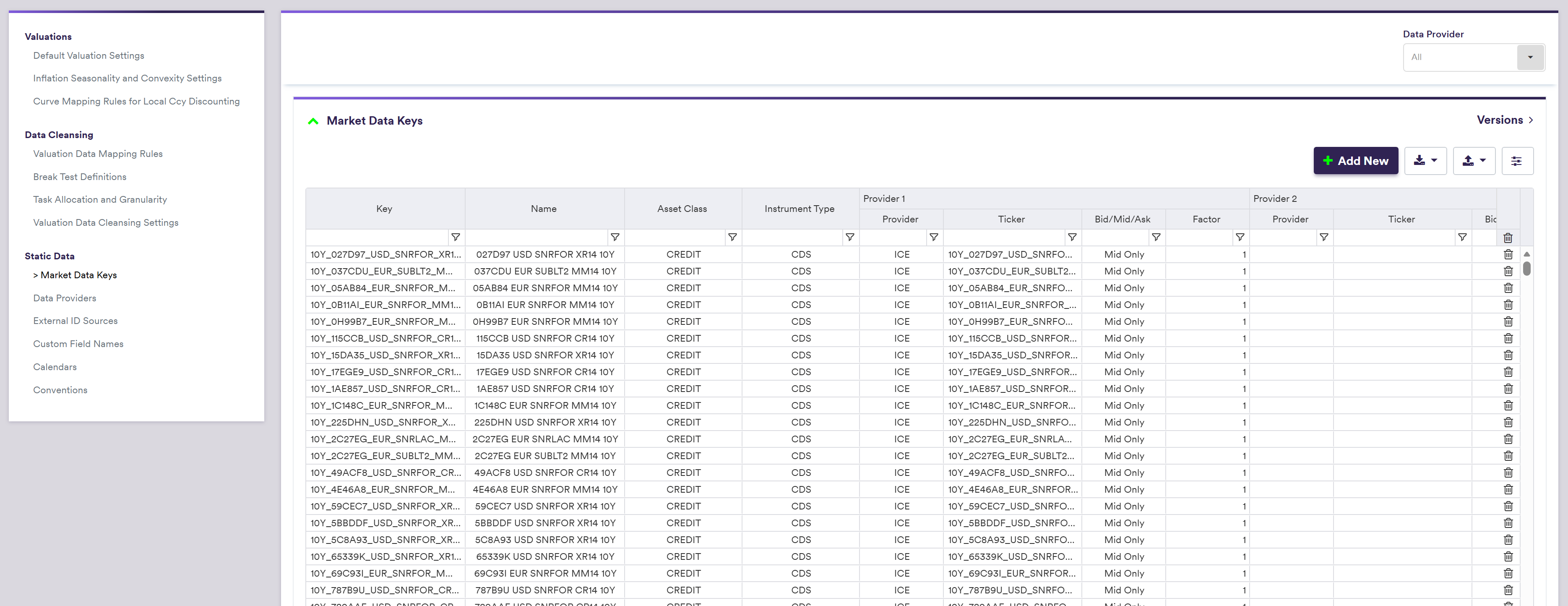 For each curve node and volatility point, Xplain automatically generates a unique identifier, referred to as a market data key (MDK), which is derived from the instrument’s characteristics (e.g. tenor) and the underlying index convention. MDKs can be viewed or exported at the curve group level or, when in edit mode, at the curve configuration level. For more detail, you can refer to the MDK Naming Convention section below.
