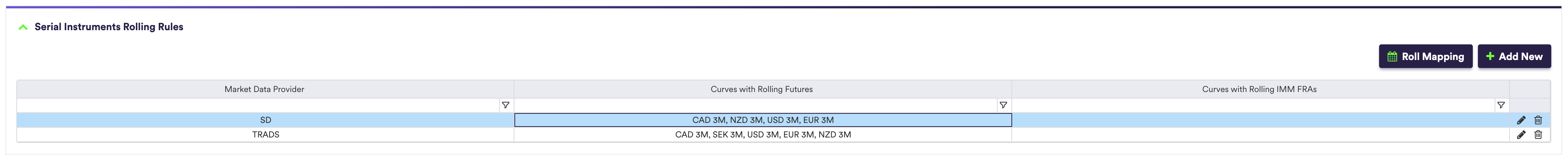 On the Market Data Keys Mapping page, after importing “MDK Definitions and Providers”, serial instruments (IBOR futures and IMM Forward Rate Agreement MDKs) can be auto‑rolled. Auto‑roll creates future versions of provider/ticker mappings for selected serial nodes, grouped by curve and provider.