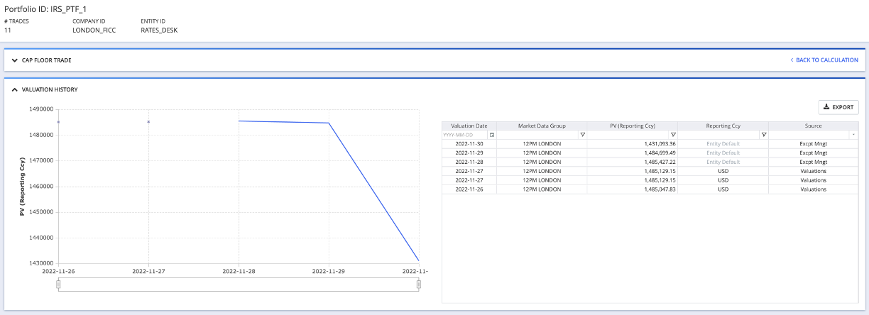 You can see more information about the applicable valuation parameters by double-clicking on a valuation history line item, which will navigate us to the PV calculation results page or the Data Cleansing Dashboard results page (as relevant).