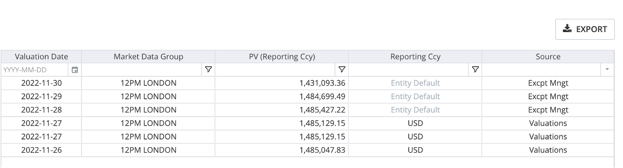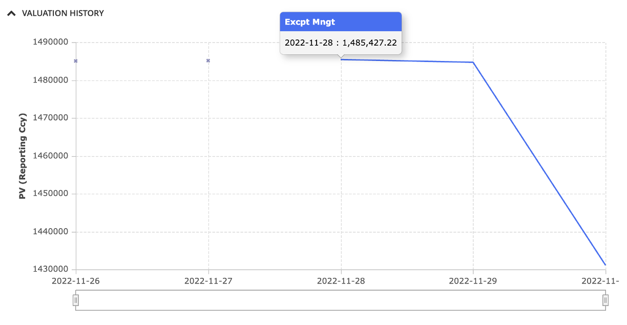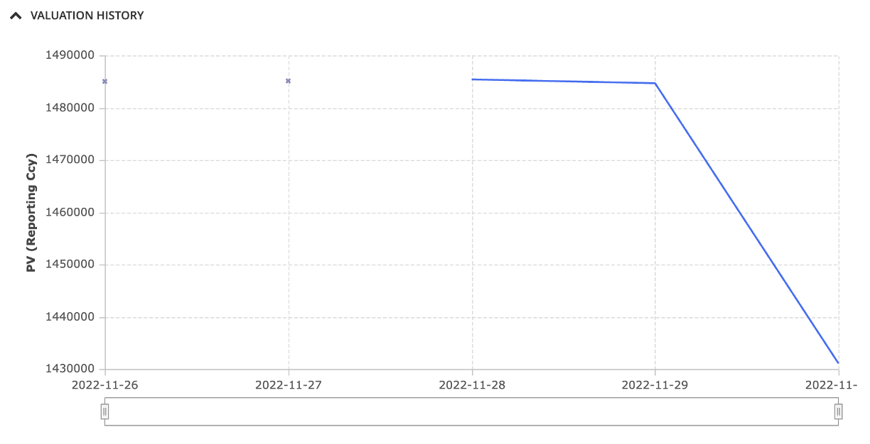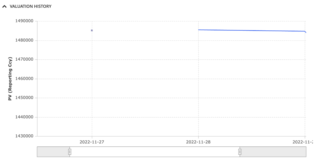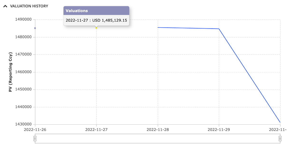 After performing and saving a valuation or completing a valuation data anomaly detection process, the valuation date and PV of each trade are added to their valuation history, which can be viewed at the trade level.